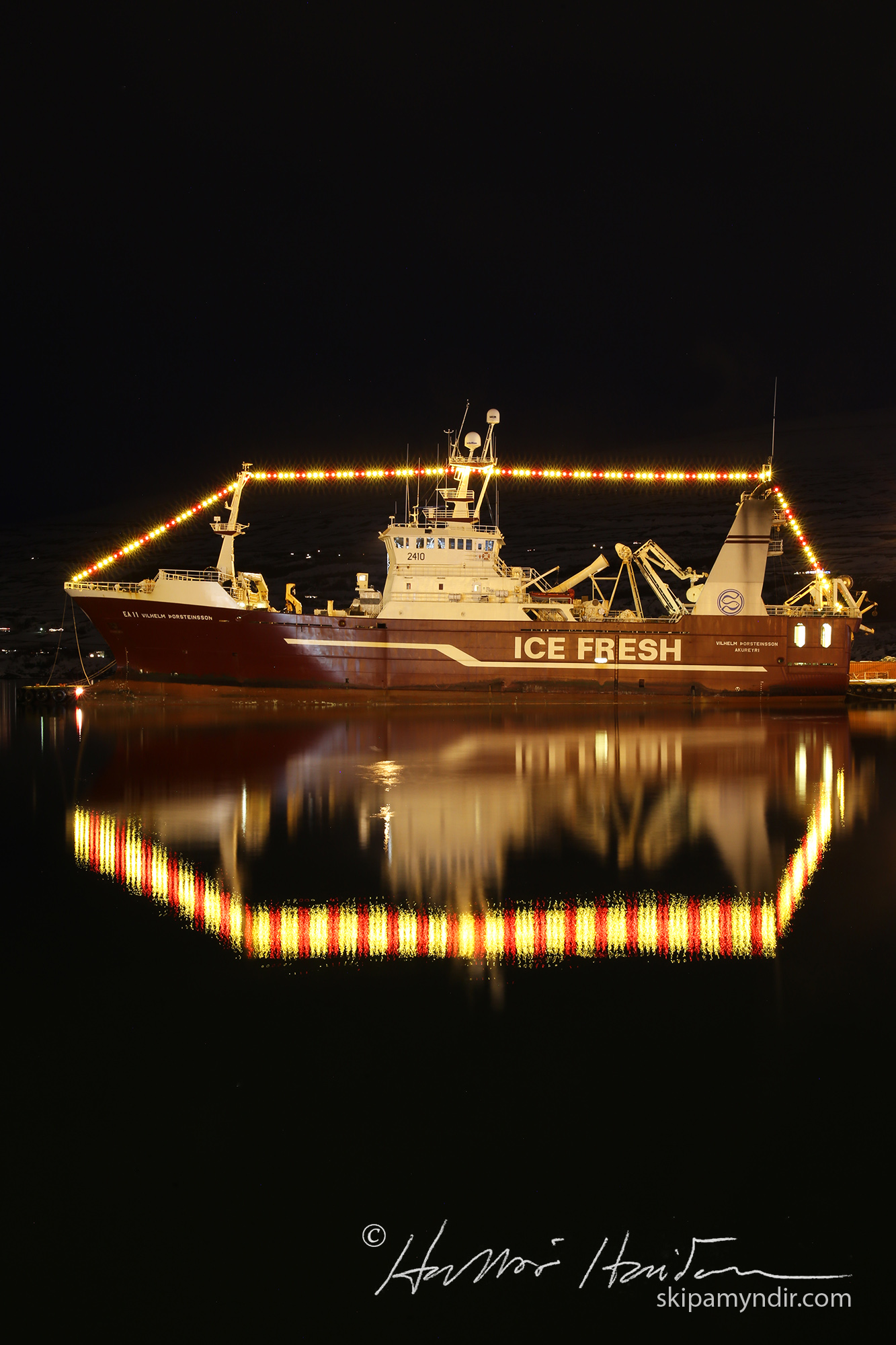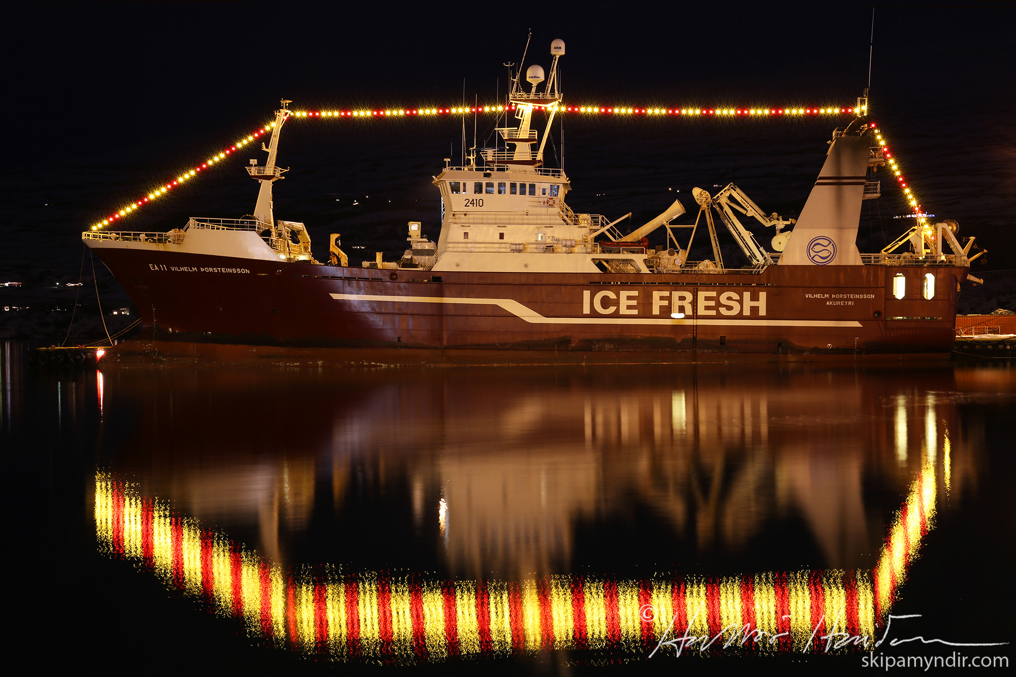 Vilhelm Þorsteinsson EA 11 liggur nú við bryggju á Akureyri með jólaseríuna uppi. Það var vel við hæfi að taka myndir af þessu mikla aflaskipi ljósum prýtt því þetta eru síðustu jól hans í íslenska fiskisskipaflotanum.