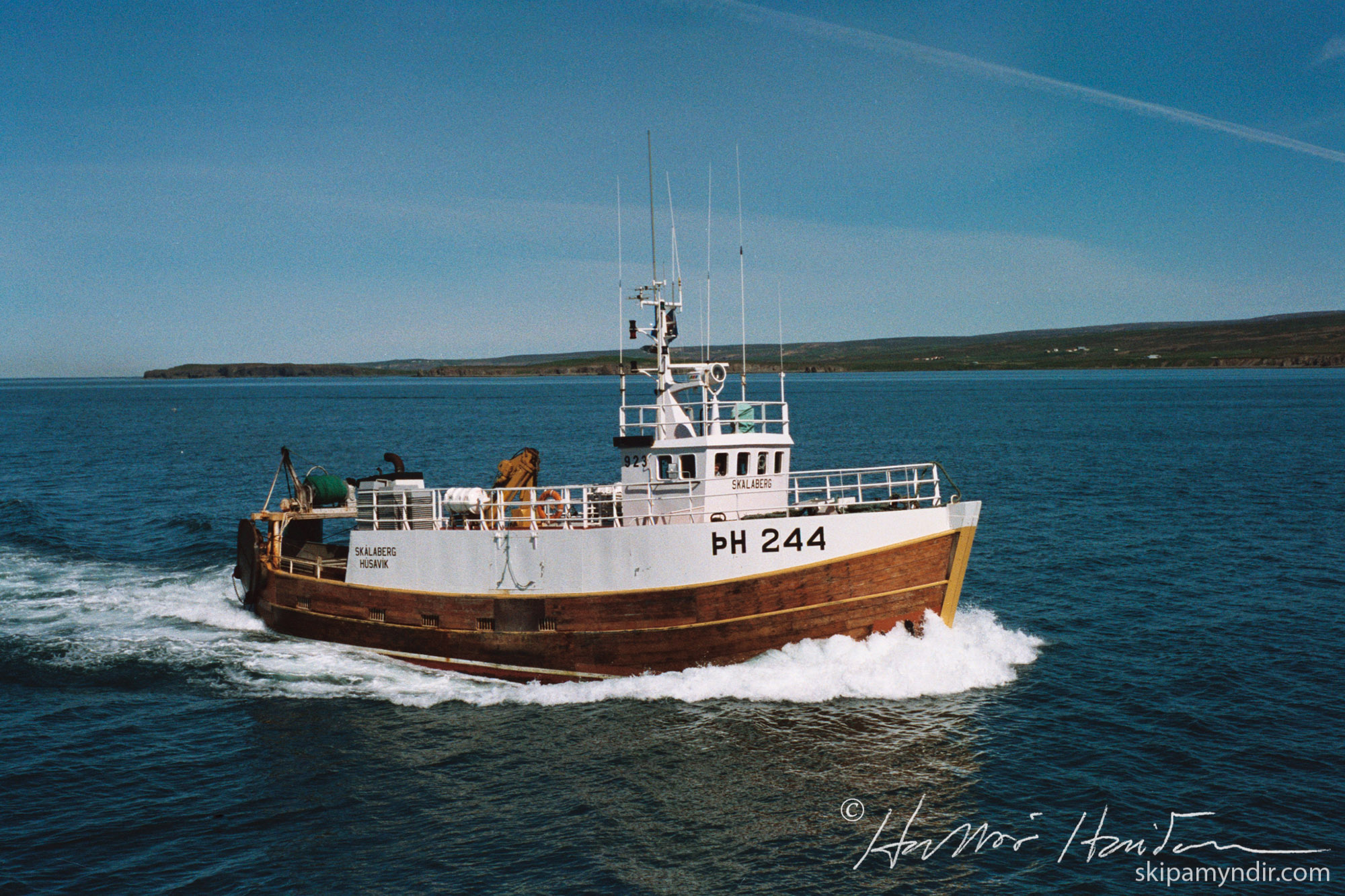 Skálaberg ÞH 244 er hér á siglingu á Skjálfandaflóa í júlímánuði 1987. Báturinn sigldi til móts við nýjan Geira Péturs ÞH 344 sem var að koma frá Noregi.