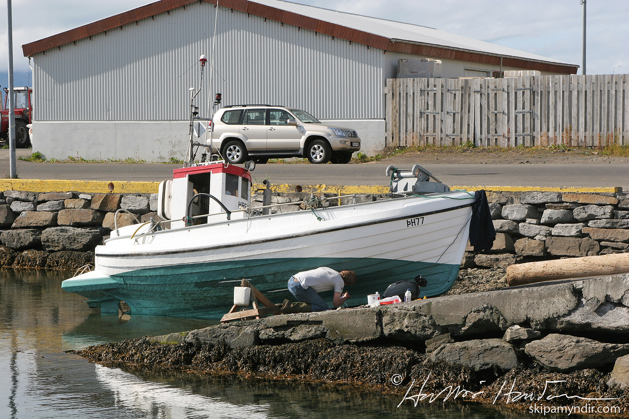 Þarna er eigandi hans Héðinn Helgason eitthvað að bardúsa áður en borinn var botnfarvi á bátinn.