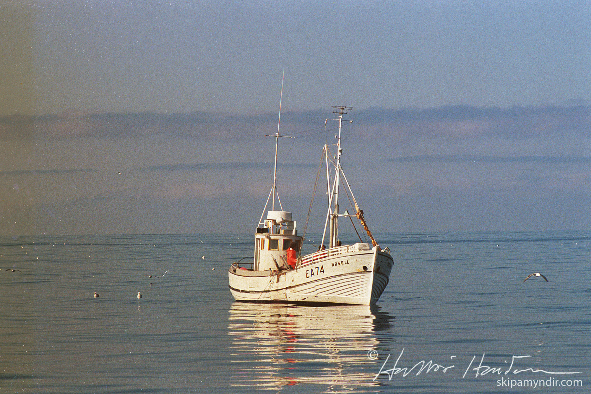 Á þessari mynd er Ársæll EA 74 við grásleppuveiðar á Skjálfandaflóa á fyrri hluta níunda áratugar síðustu aldar.