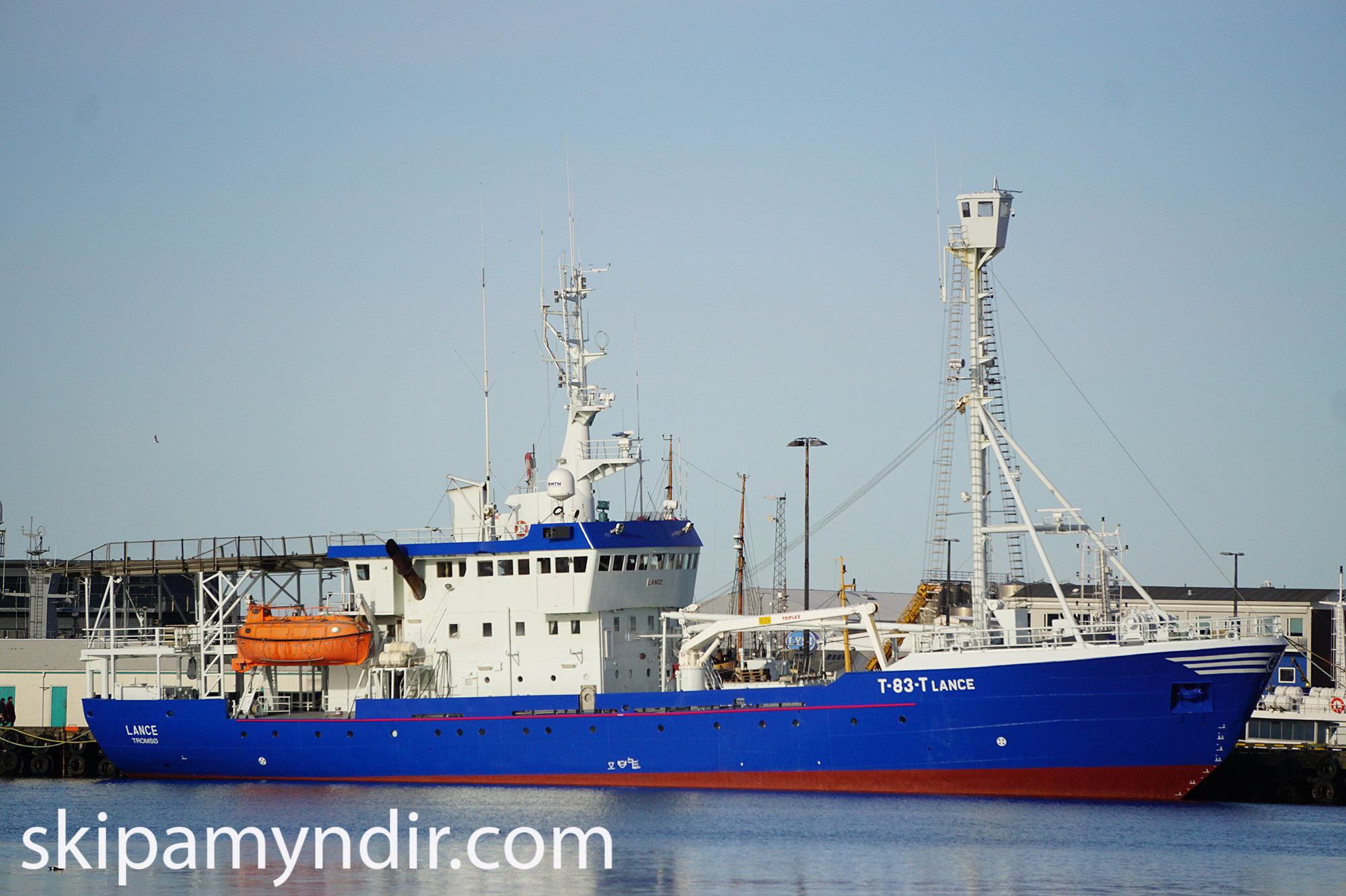 Norska rannsóknar- og eftirlitsskipið Lance T-83-T, sem verið hefur að undnaförnu í skveringu hjá Stálsmiðjunni í Reykjavík, liggur hér nýmálað við bryggju.