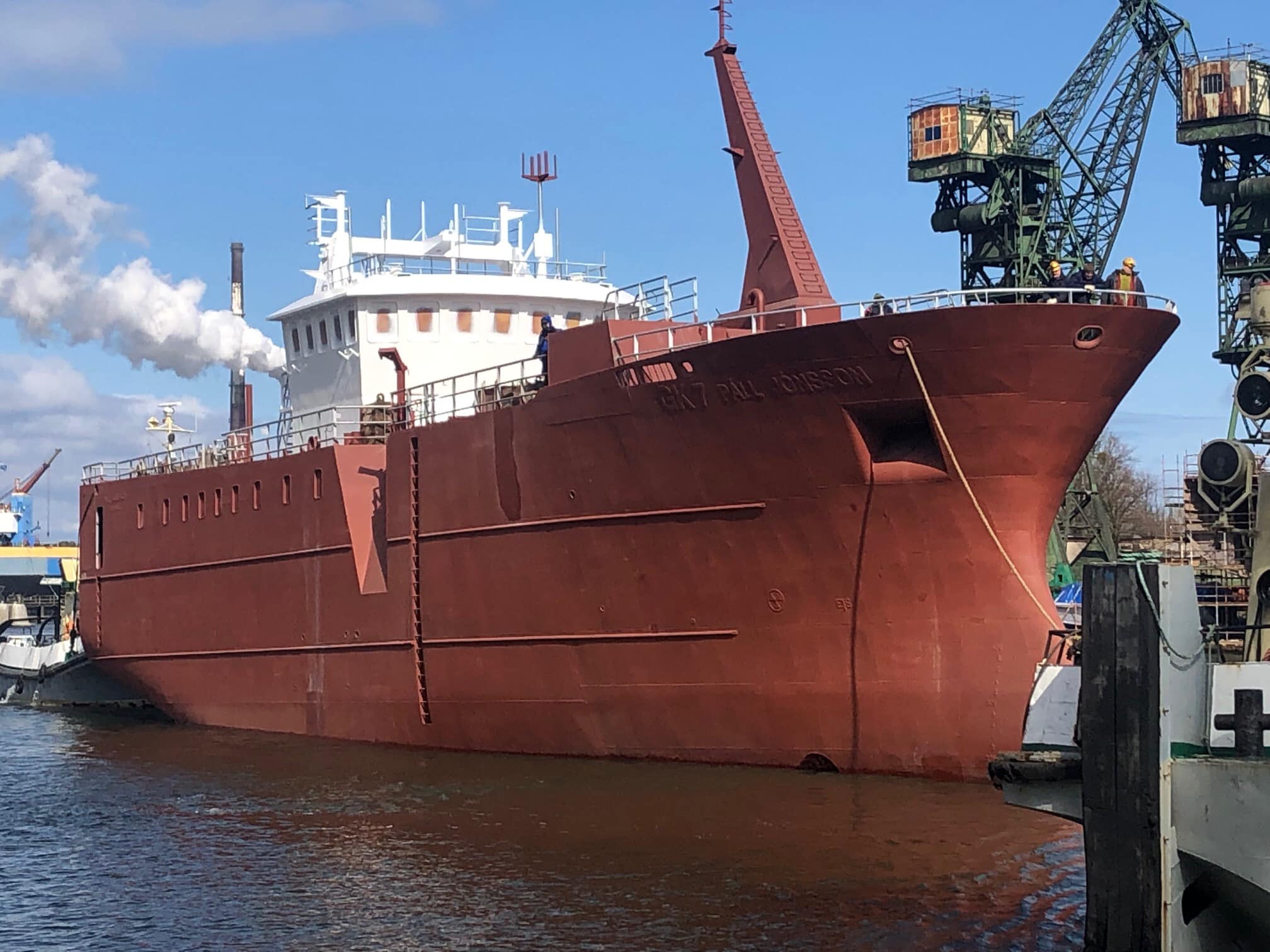 Eins og sagði hér á síðunni í gær var stefnt að því að þetta glæsilega 45 metra langa og 10,5 metra breiða línuskip sem er á myndunum færi á flot í dag.