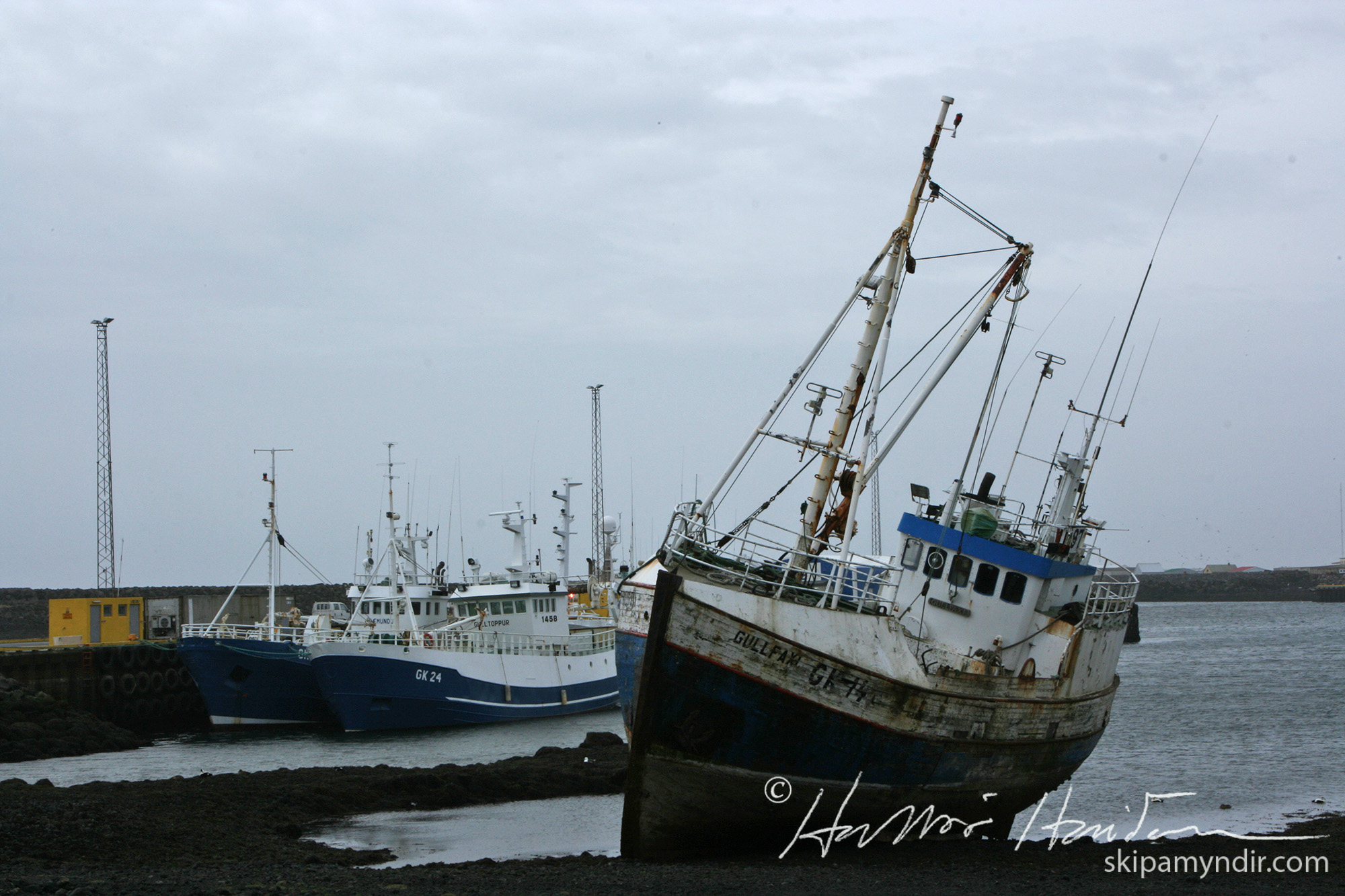 Hér er Gullfaxi GK 14 kominn á endastöð í fjörunni í Grindavík þar sem hann var rifinn vorið 2008.
