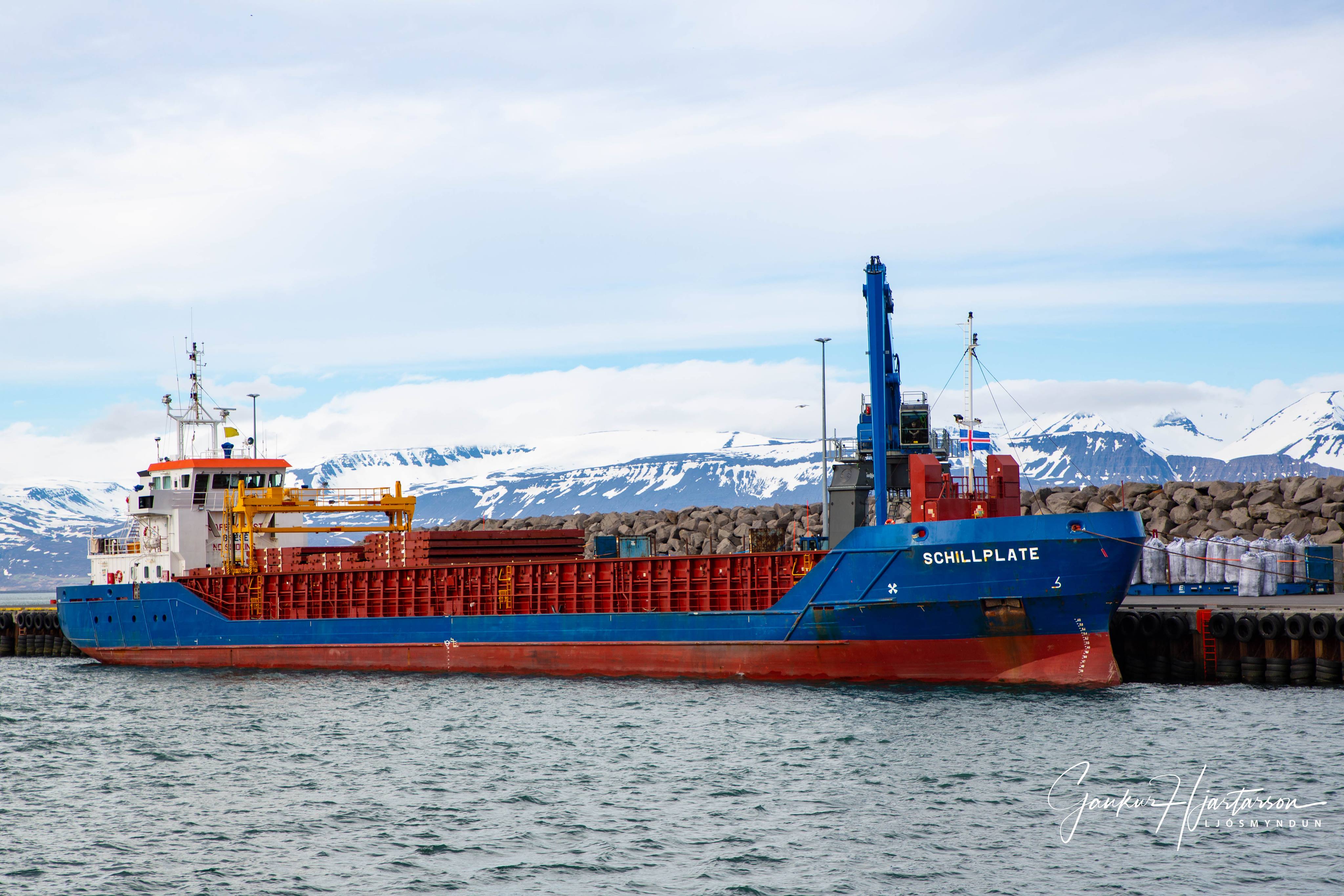 Flutningaskipið Schillplate kom upp að Bökugarðinum í morgun með hráefnsfarm fyrir PCC á Bakka.