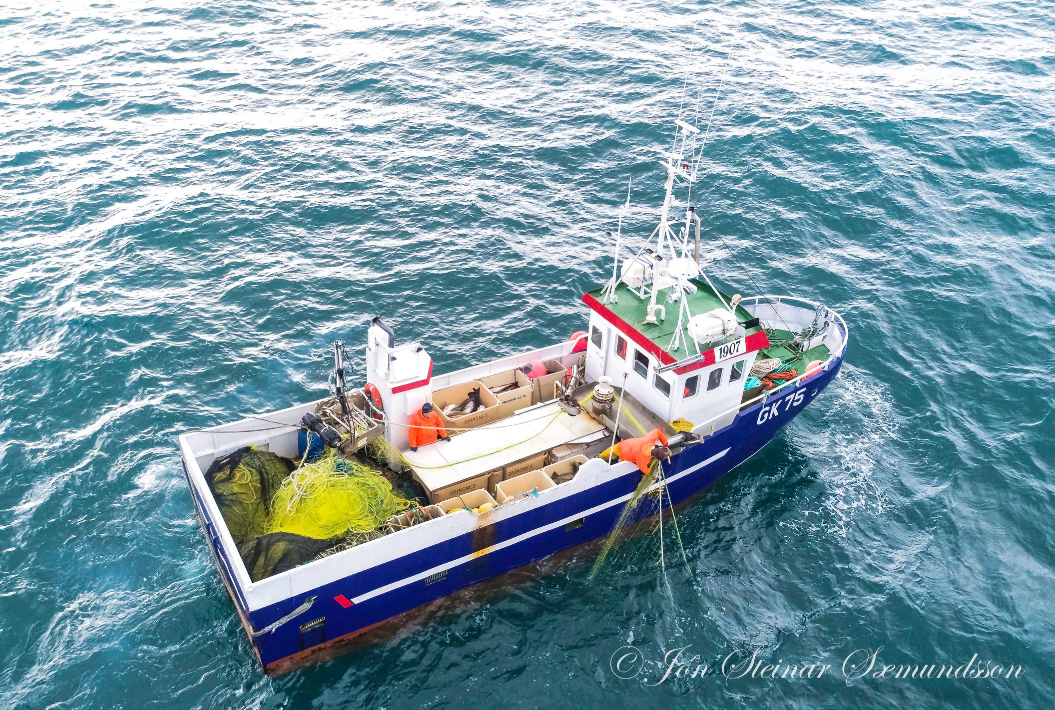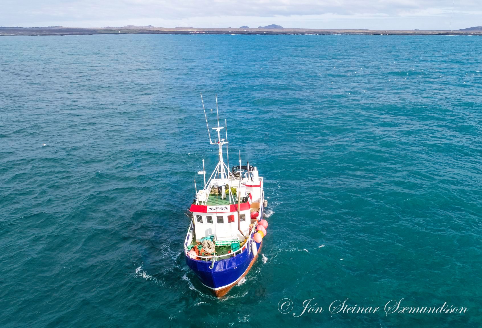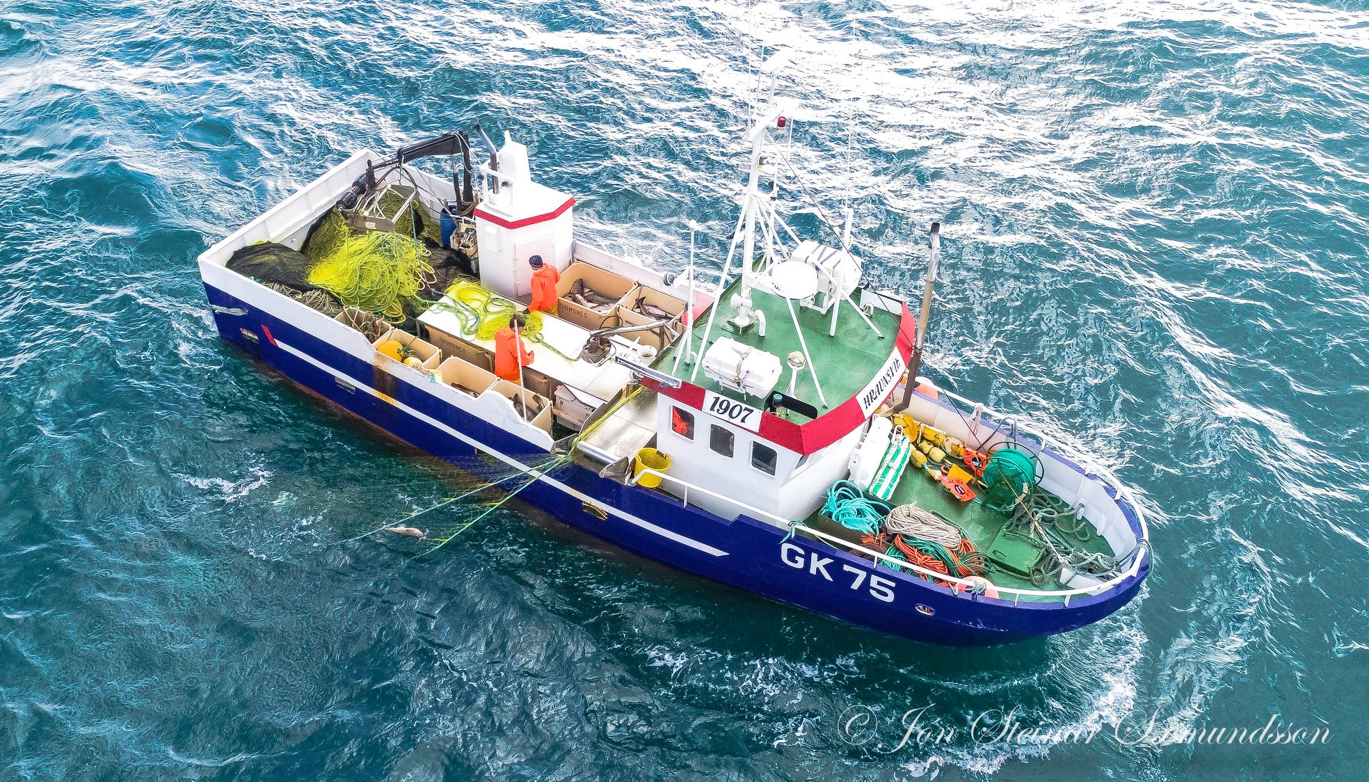 Jón Steinar tók þessar drónamyndir í morgun af netabátnum Hraunsvík GK 75 draga netin út af Arfadalsvík rétt vestan Grindavíkur.