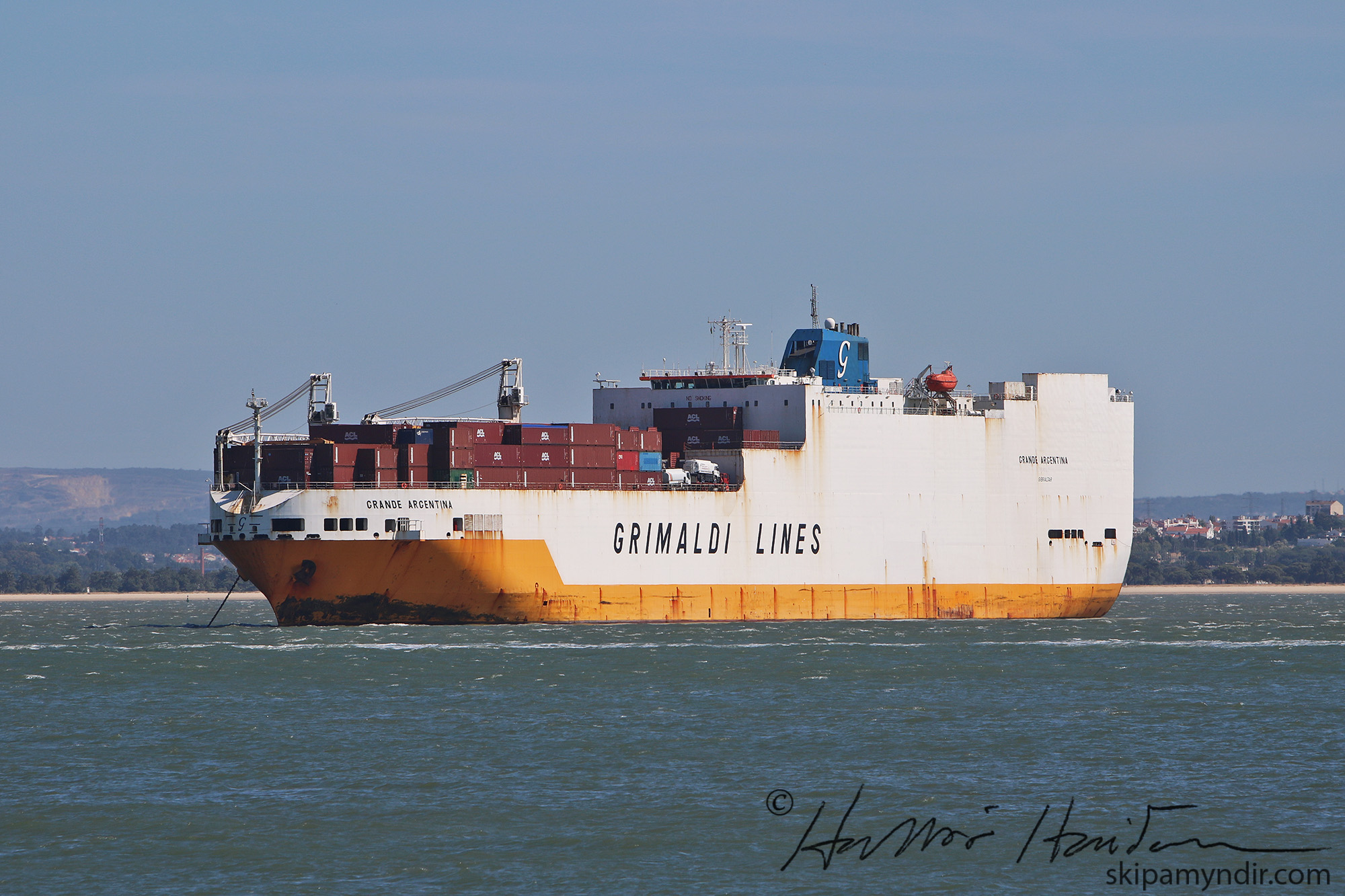Bílaflutningaskipið Grande Argentina hefur legið við festar á ánni Tagus framundan Lissabon undanfarna daga.