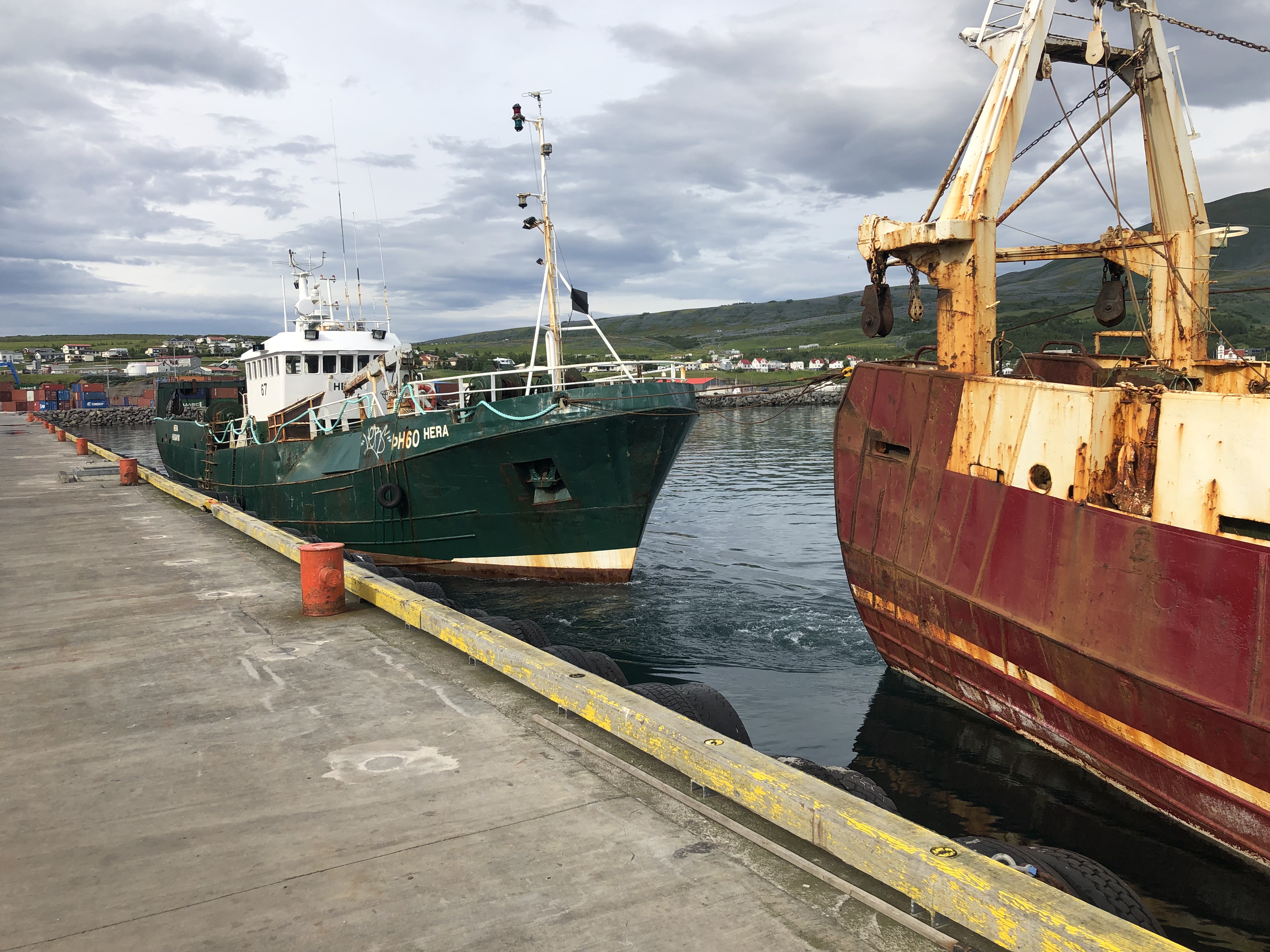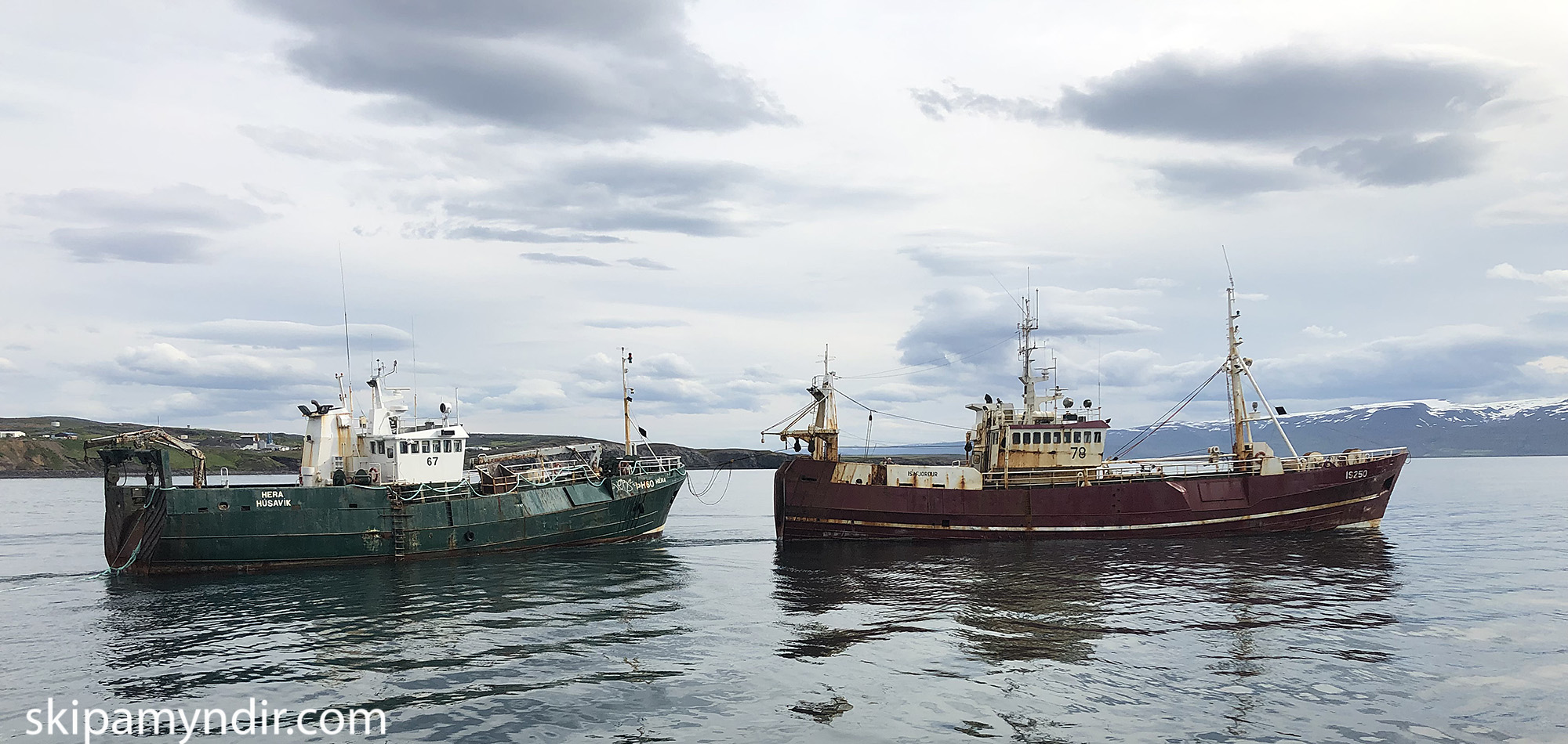 Hera ÞH 60 kom í slefi til Húsavíkur í gær en Ísborg ÍS 250 er á leiðinni með hana til Belgíu þar sem bátarnir fara báðir í brotajárn.