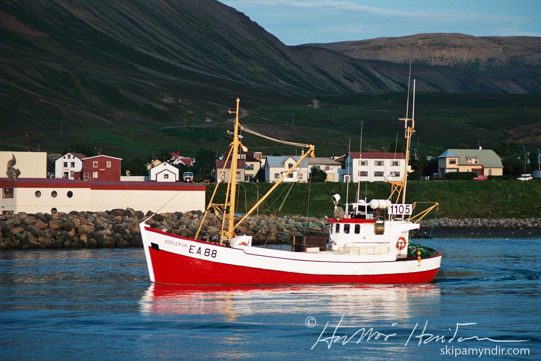 Þorleifur EA 88 úr Grímsey er þarna nýbúinn að taka rækjutrollið um borð á Húsavík eitt sumarkvöldið seint á níunda áratug síðustu aldar.