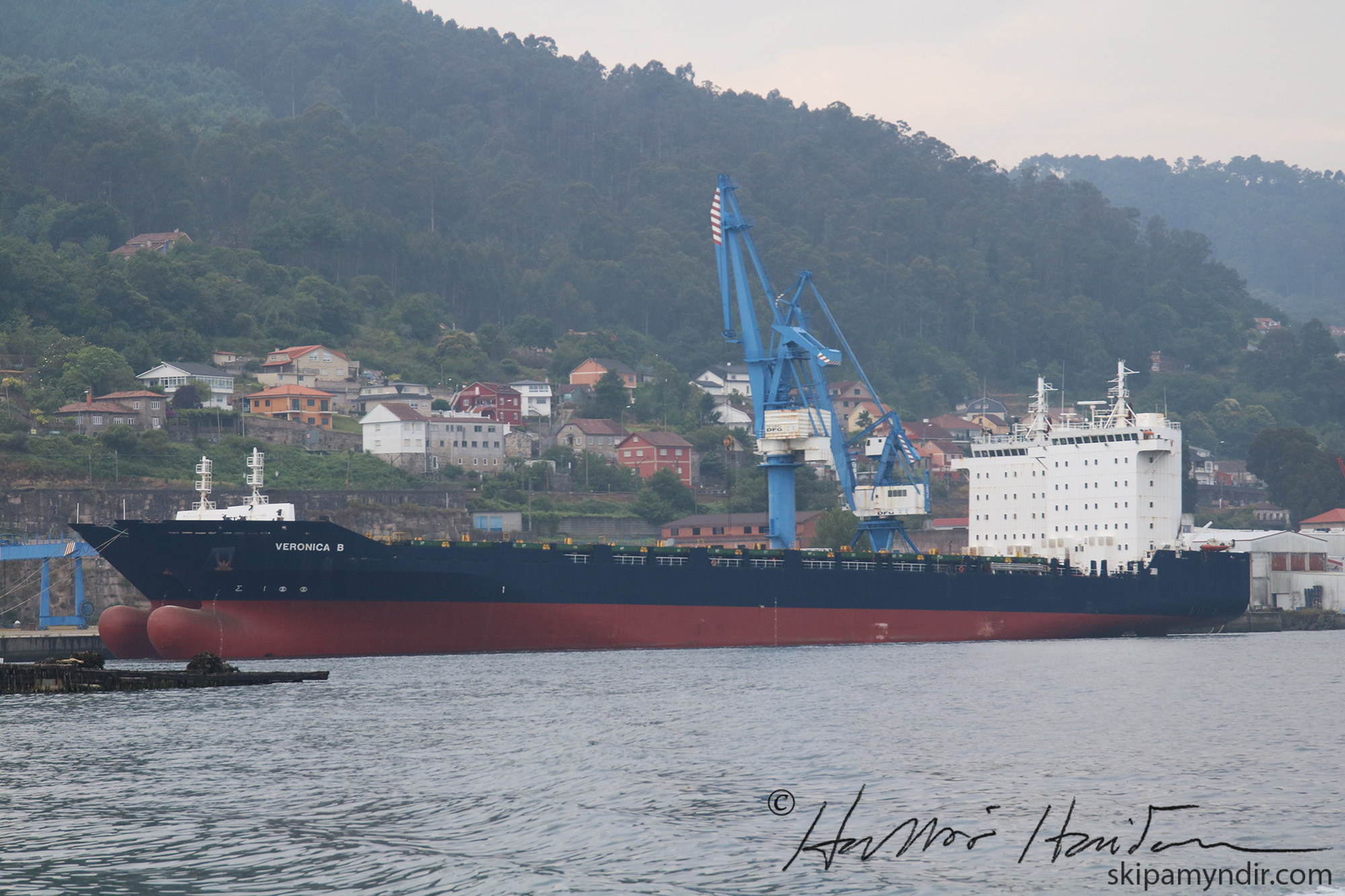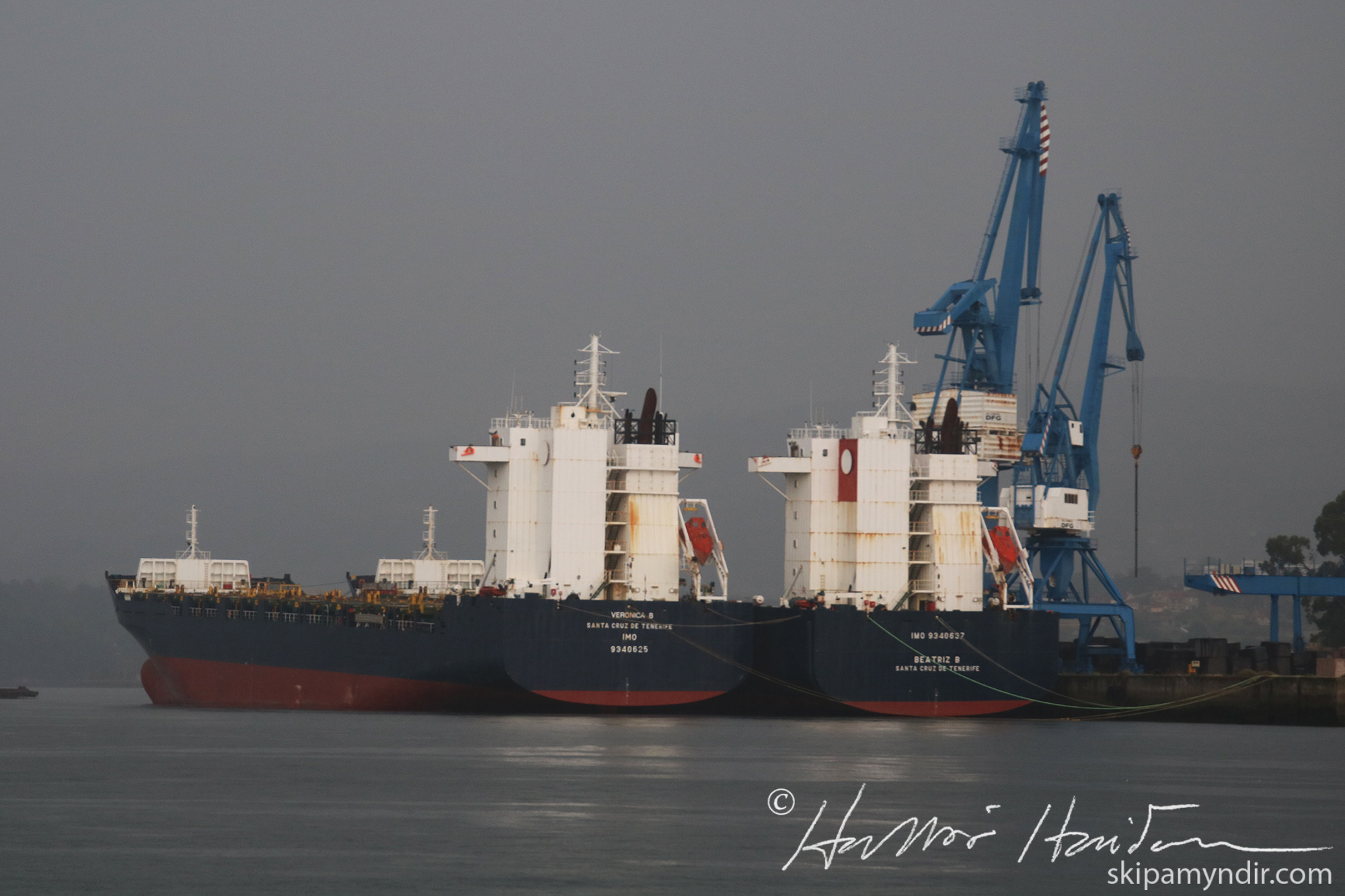 Flutningaskipin Veronica B og Beatriz B liggja við bryggju í Randes í Vigoflóanum innanverðum.