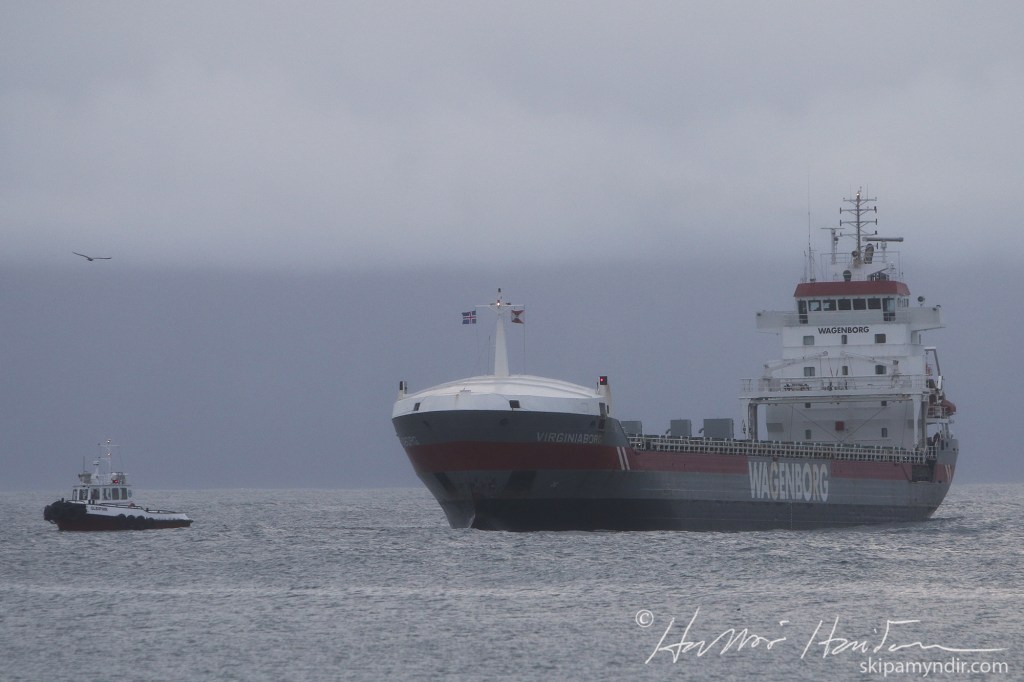 Flutningaskipið Virginiaborg kom til Húsavíkur nú undir kvöld og tók Sleipnir á móti því.