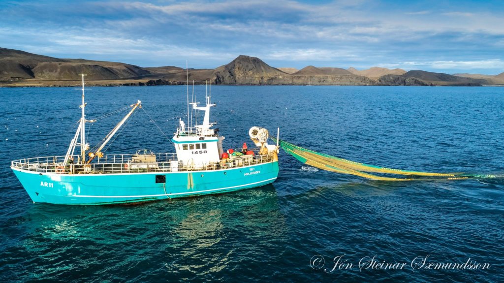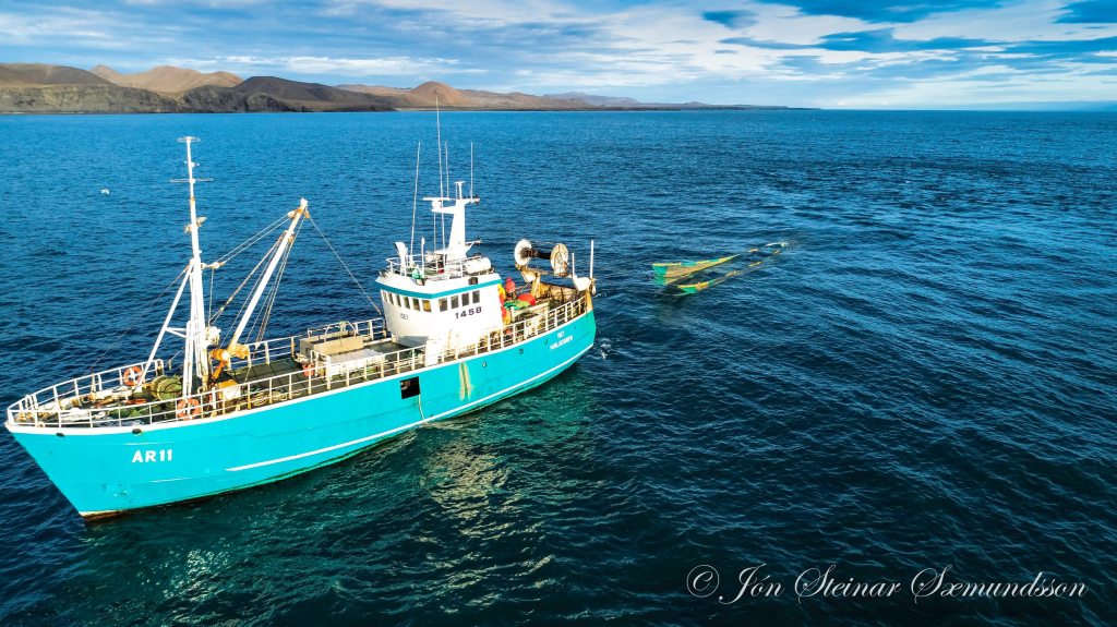 Jón Steinar sendi drónann út til að mynda dragnótabátinn Ísey ÁR 11 sl. föstudag þar sem hún var að veiðum á Hraunsvíkinni.