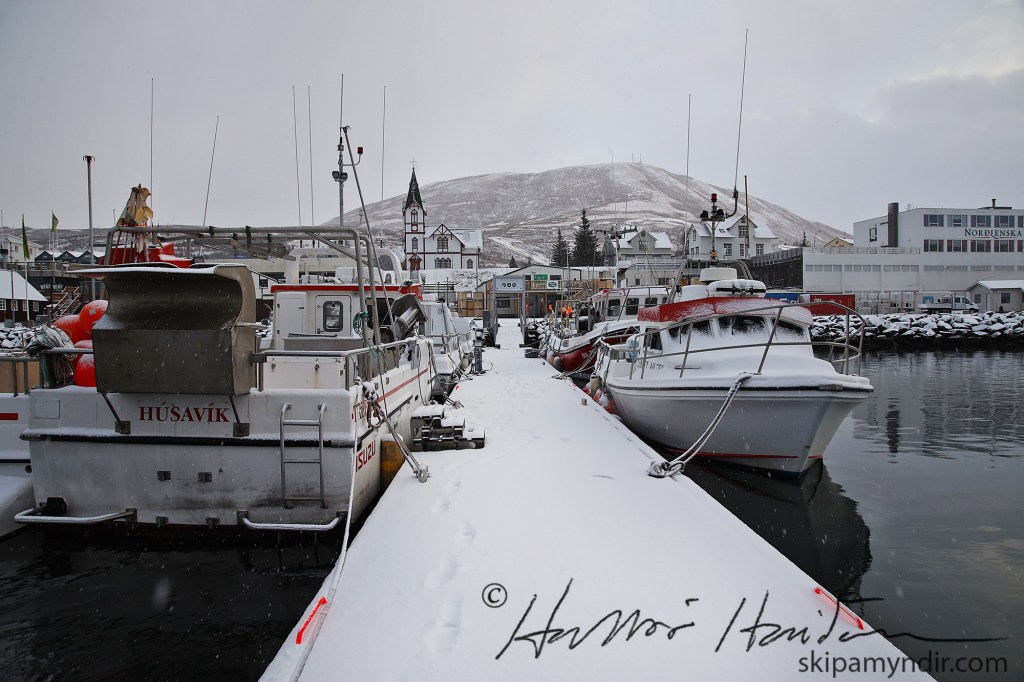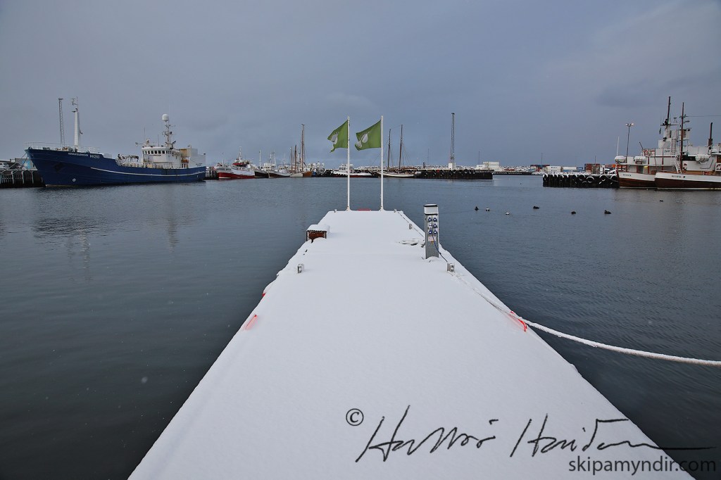 Hann var hægur í morgun þegar ég fór niður að höfn með myndavélina en gekk á með éljum.