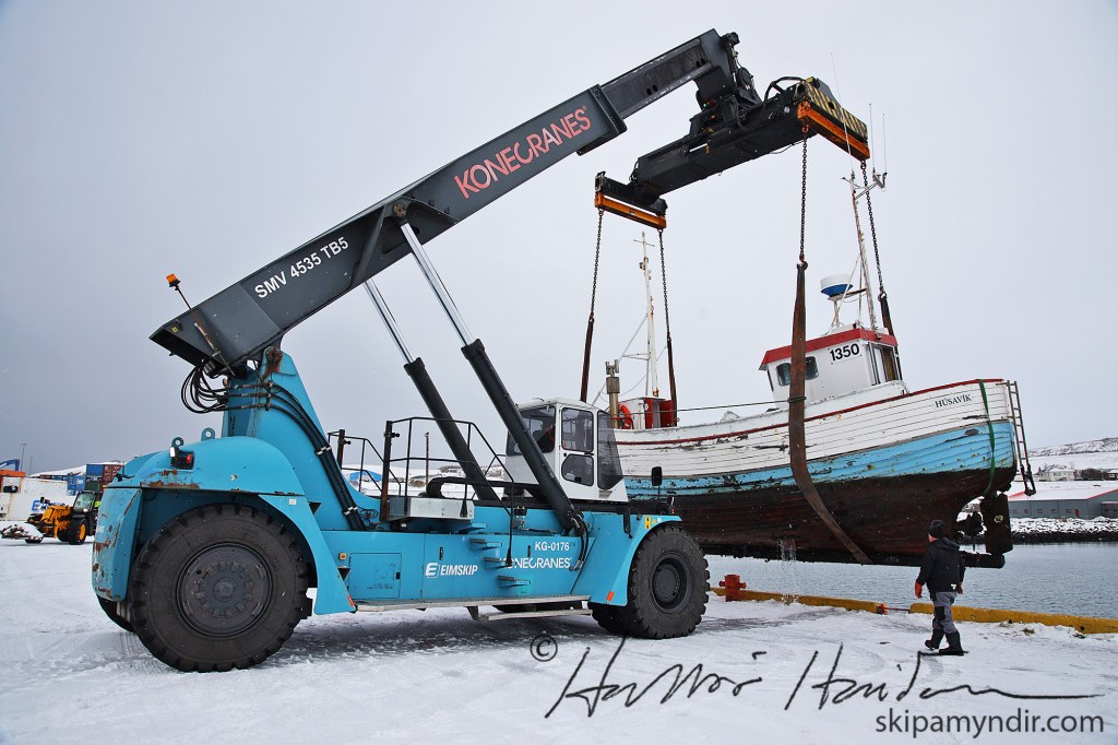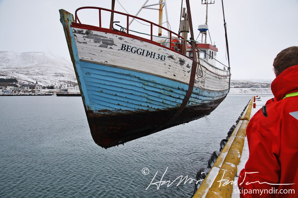 Beggi ÞH 343 var hífður á land á Húsavík um miðjan daginn en hann sökk við bryggju í morgun.