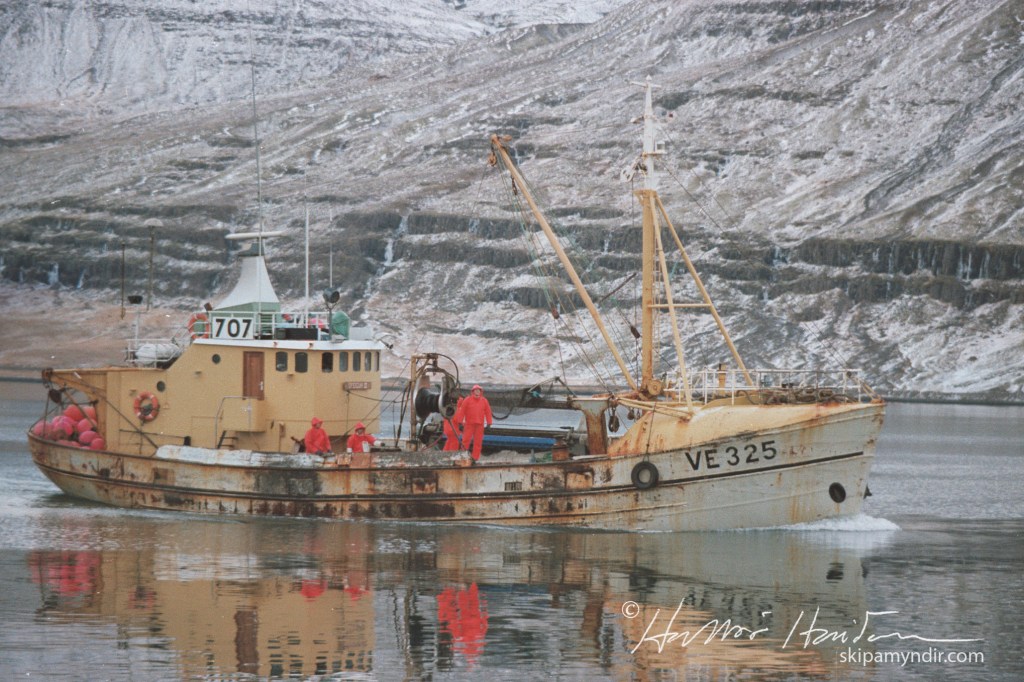 Ófeigur III VE 325, sem hér siglir inn Reyðarfjörð, var smíðaður í Hollandi árið 1955 og hét sama nafninu alla tíð.