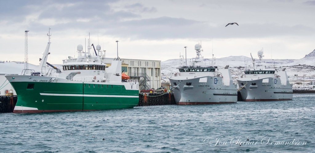 Fremstur er línuveiðarinn Páll Jónsson GK sem smíðaður var fyrir Vísi í Póllandi og aftan við hann systurskipin Vörður ÞH 44 og Áskell ÞH 48. Skrokkar þeirra voru smíðaðir í Víetnam en skipin fullkláruð í Noregi.