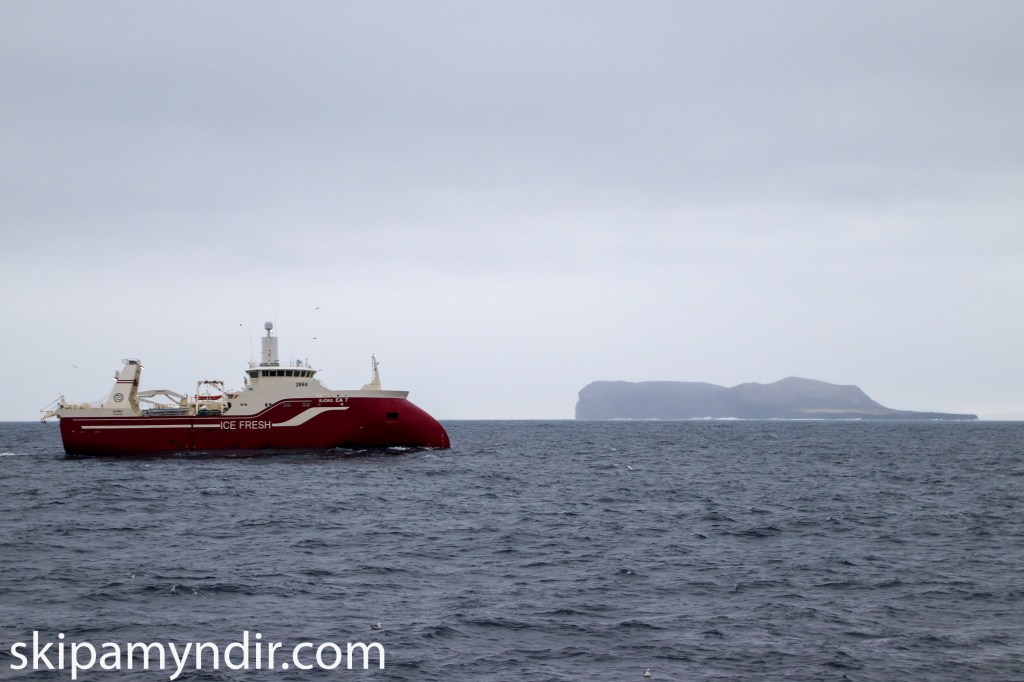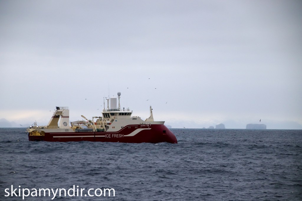 Hólmgeir Austfjörð skipverji á Ottó N Þorlákssyni VE 5 tók þessar myndir um kl. 7 í morgun og sýna þær Samherjatogarann Björgu EA 7 að veiðum sunnan við Surtsey.
