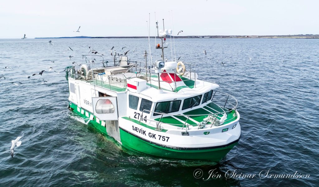 Sævíkin GK 757 var að draga línuna á Staðarbrúninni rétt vestan Grindavíkur í dag þegar Jón Steinar sendi drónann í myndatökutúr nú um miðjan daginn.