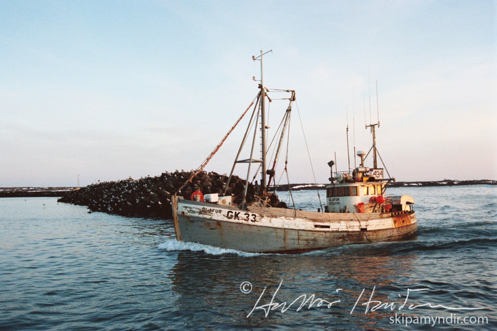 Ólafur GK 33, sem hér kemur til hafnar í Grindavík um árið, var smíðaður í Struer í Danmörku árið 1945. Hann var 36 brl. að stærð, búinn 150 hestafla Volund dieselvél.