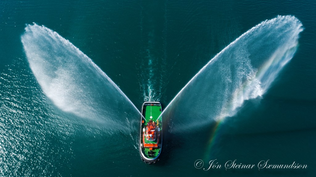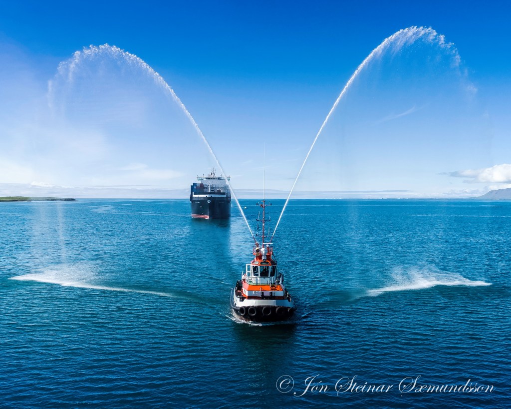 Hann sigldi heiðurssiglingu á undan hinu nýja skipi og myndaði stóran og fallegan vatnsboga með slökkvibyssum sínum.