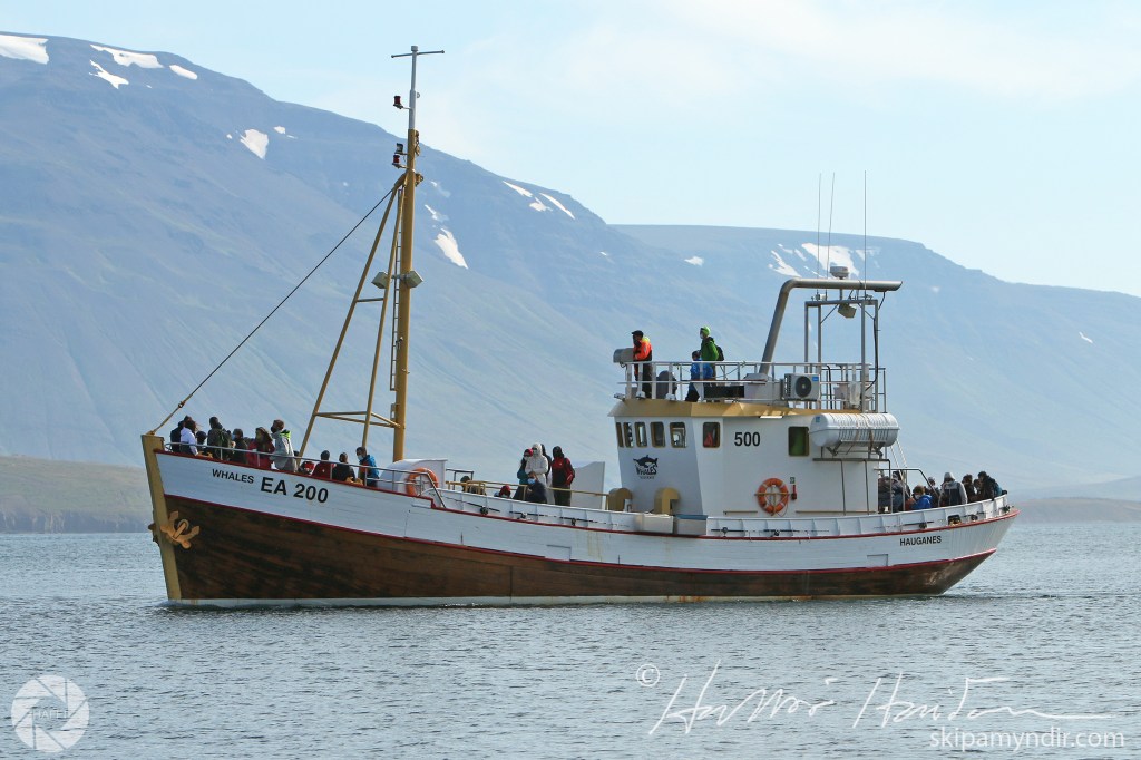 Hvalaskoðunarbáturinn Whales EA 200 kemur hér að landi á Hauganesi í byrjun vikunnar.