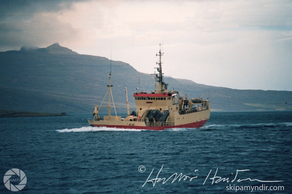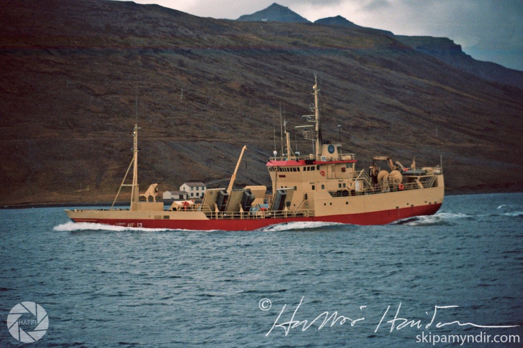 Eldborg HF 13 siglir hér til hafnar á Eskifirði haustið 1984, eða 1986, og myndin var tekin úr síldveiðibátnum Geira Péturs ÞH 344.