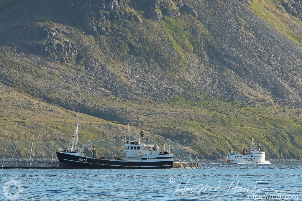 Þetta varð afraksturinn, Indriði Kristins siglir hjá fiskeldiskví þar sem Haukur BA 56 lá við en hann er þjónustubátur við fiskeldið þar vestra.
