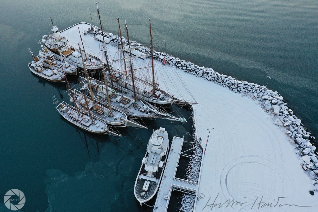 Þetta eru Garðar, Bjössi Sör og Knörrinn. Skonnorturnar Donna Wood, Ópal, Hildur og Haukur. Og Andavari en Náttfari var við flotbryggju en hann er enn að sigla og Sæborgin upp í slipp.