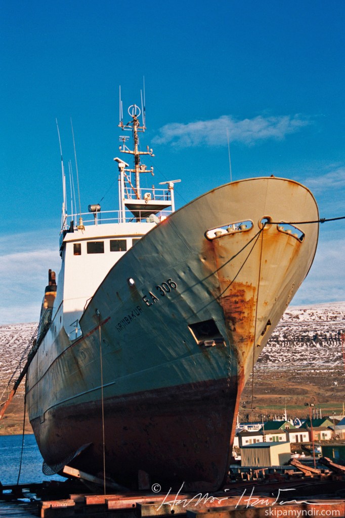 ÚA togarinn Hrímbakur EA 306 er hér í slipp á Akureyri um árið en hann hét upphaflega Bjarni Herjólfsson ÁR 200 og var smíðaður í Póllandi árið 1977.
