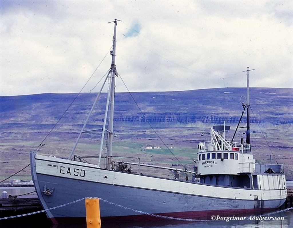 Akraborg EA 50 sem hér sést við bryggju á Akureyri var smíðuð í Svíþjóð árið 1943 en komst í eigu Valtýs Þorsteinssonar á Akureyri árið 1947.