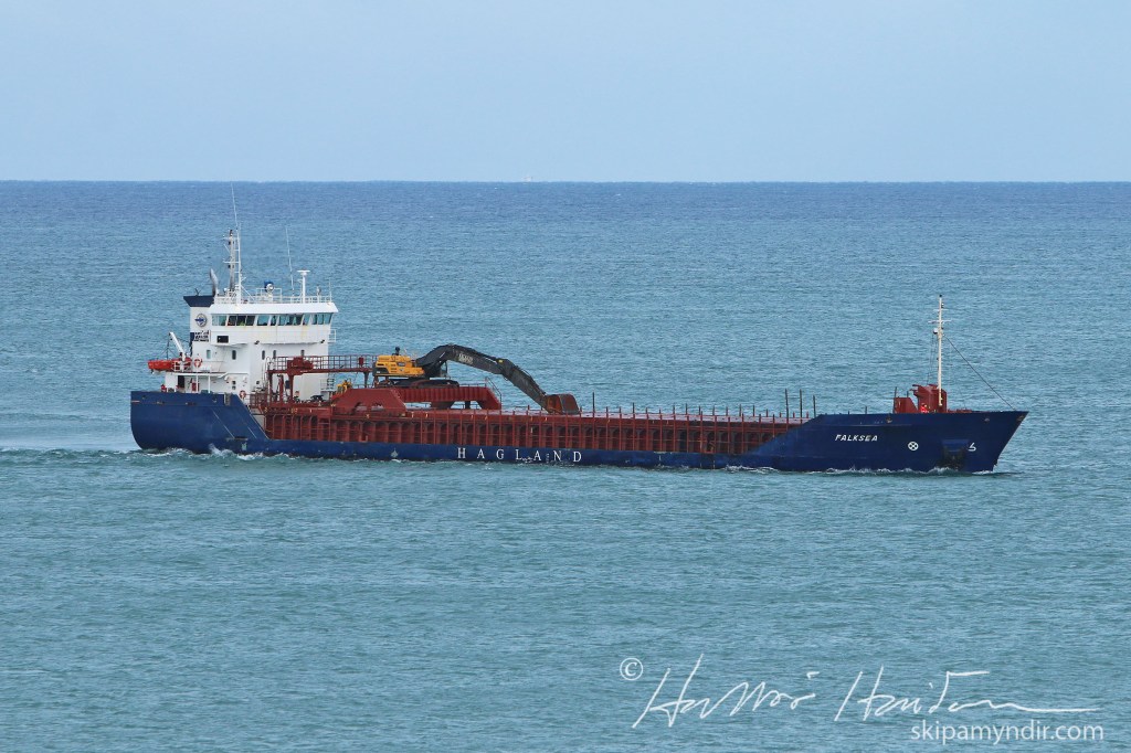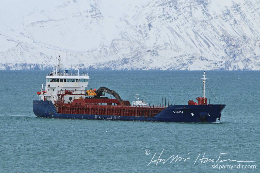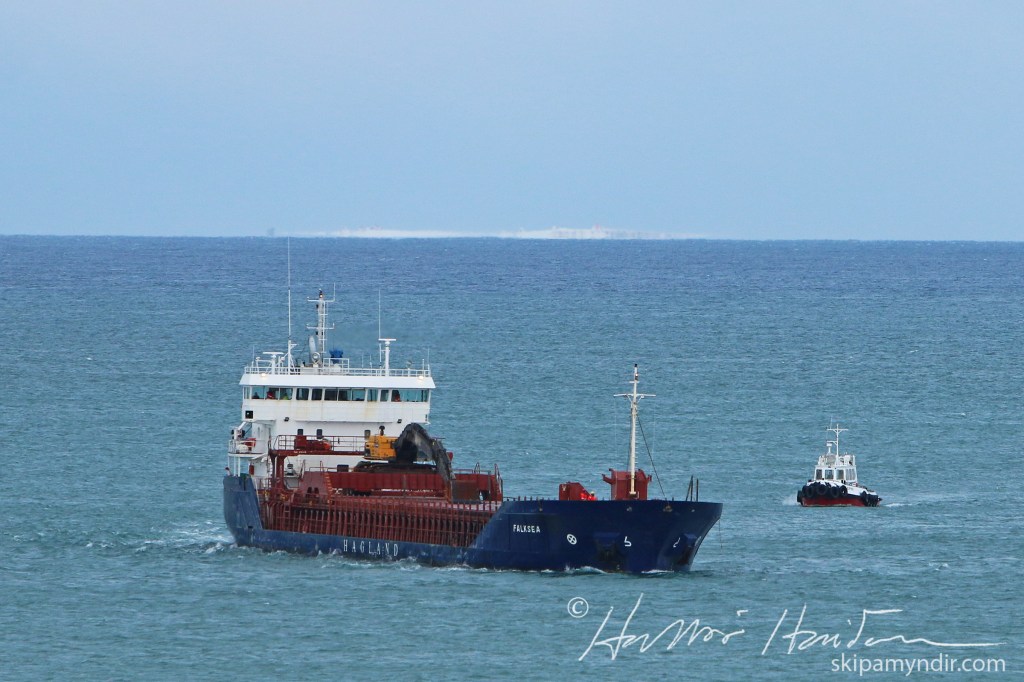 Norska flutningaskipið Falksea kom með saltfarm til Húsavíkur núna á níunda tímanum og fór hafnsögubáturinn Sleipnir með lóðs um borð.