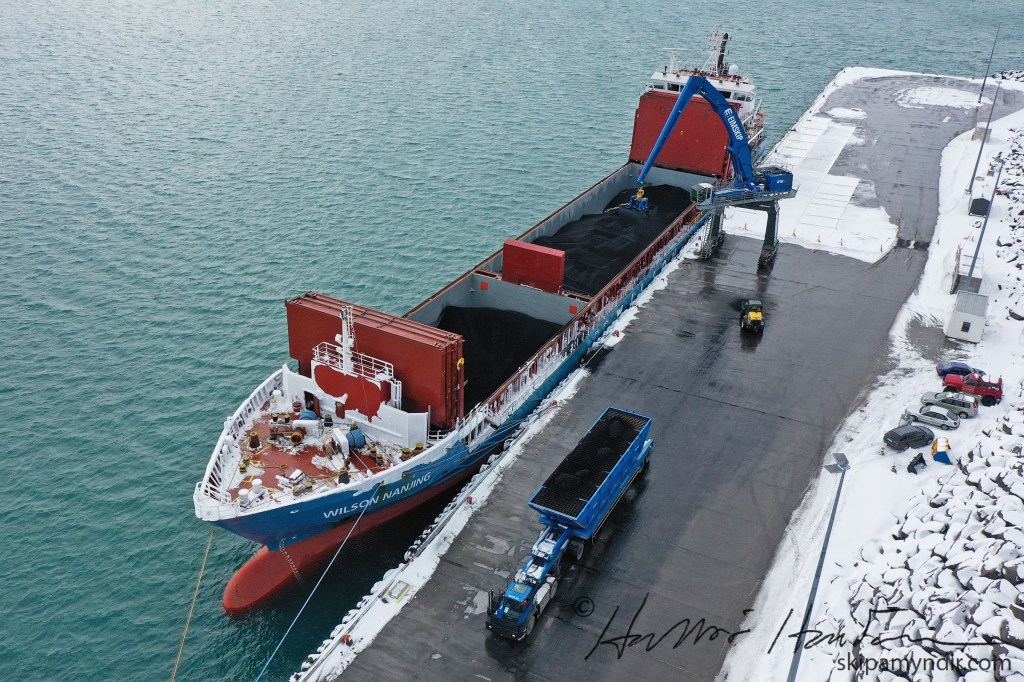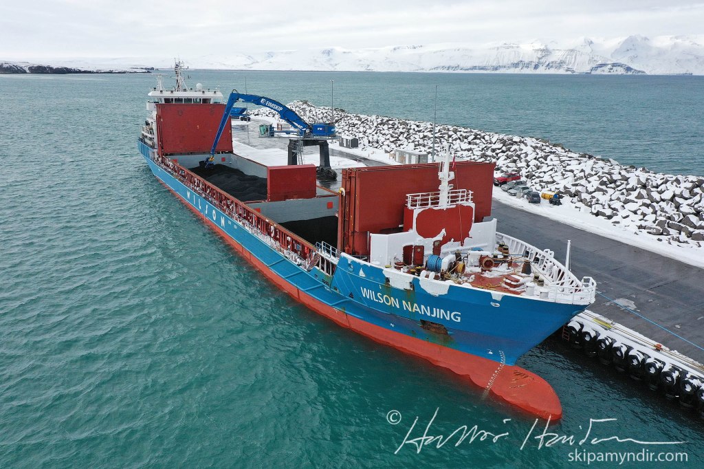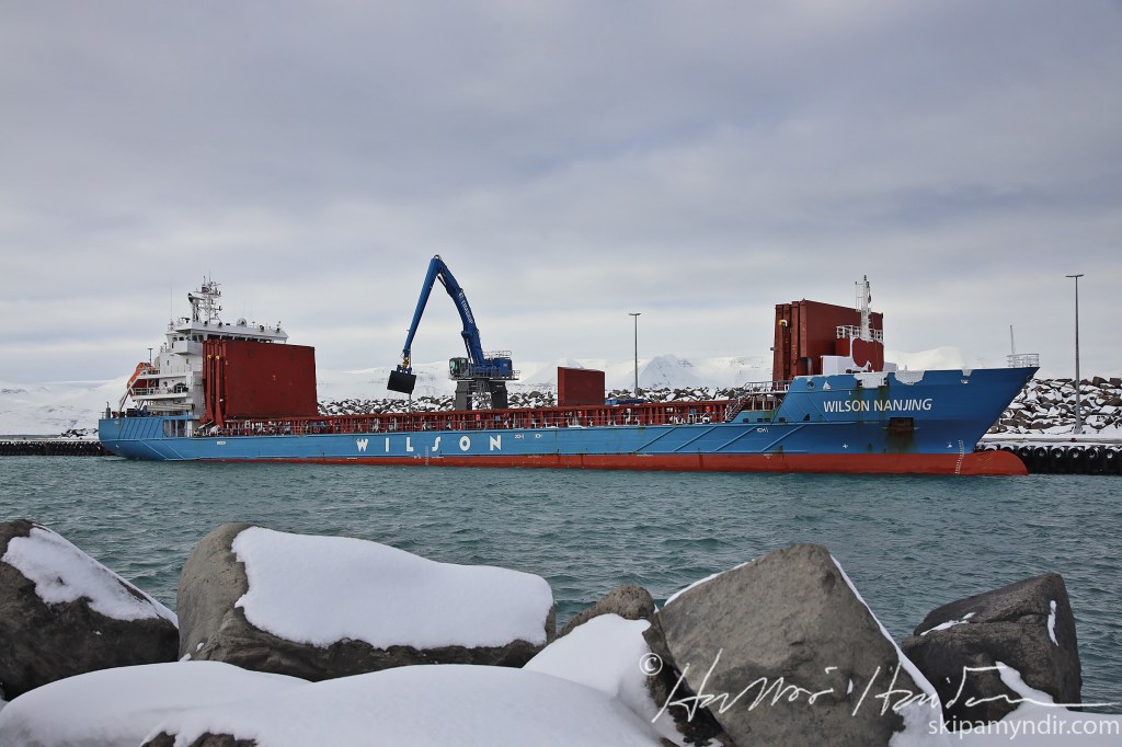 Flutningaskipið Wilson Nanjing kom til Húsavíkur snemma í morgun og lagðist að Bökugarðinum hvar nú er verið að skipa upphráefnisfarmi fyrir PCC á Bakka.