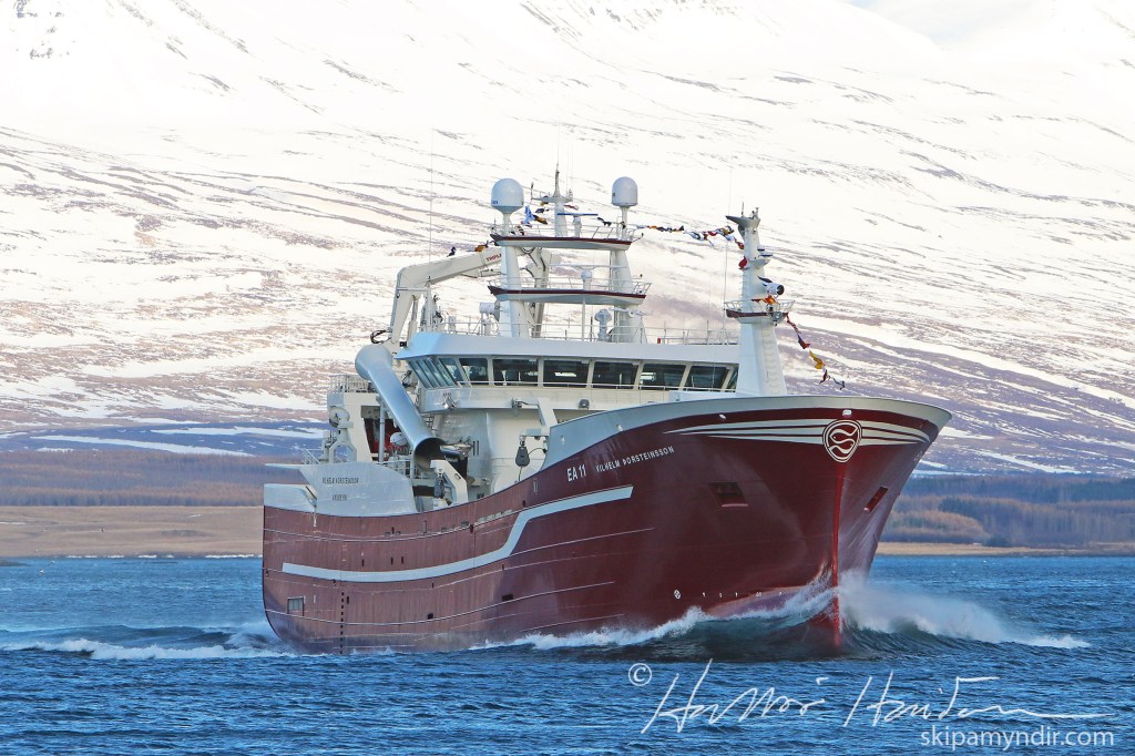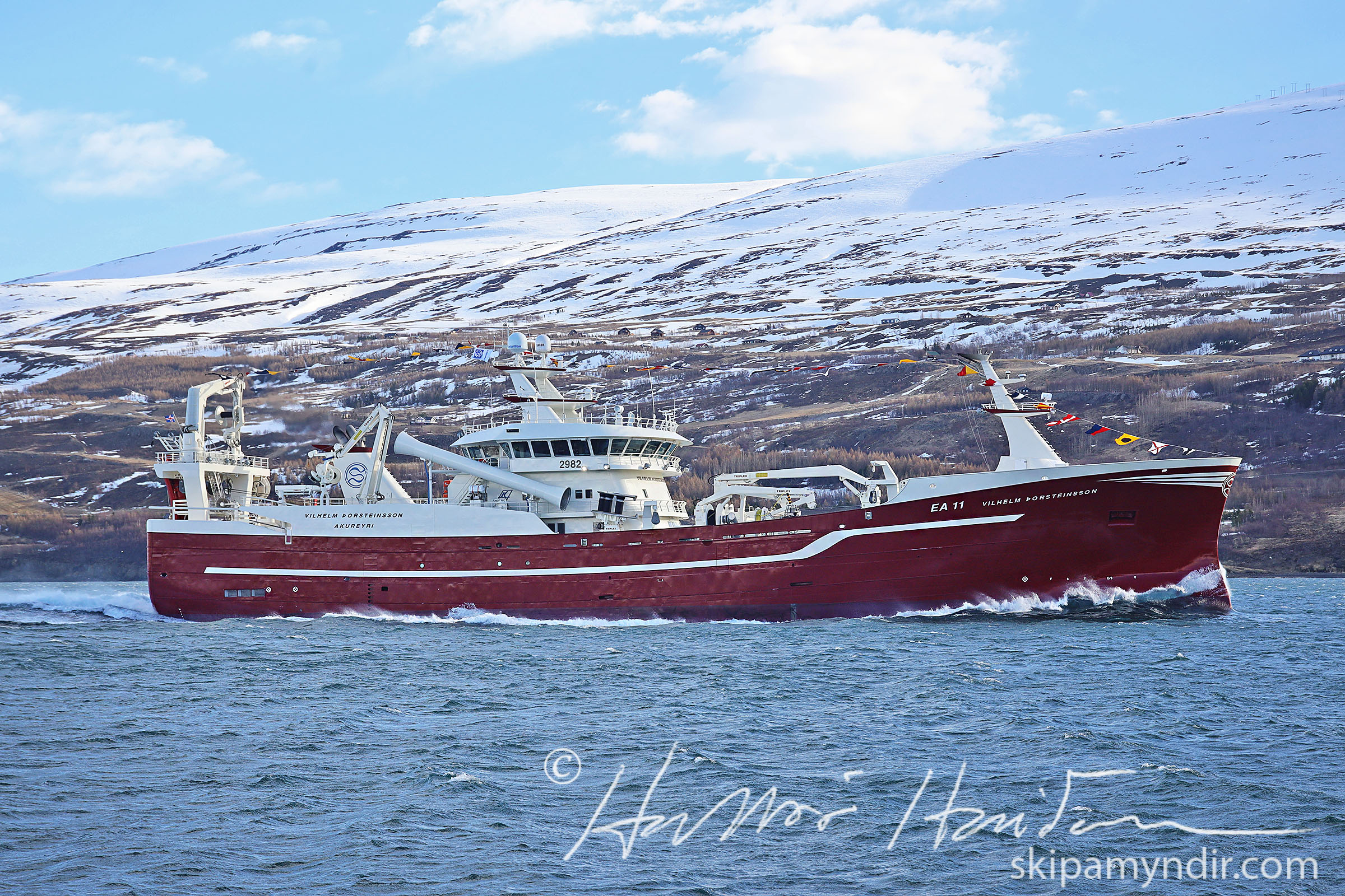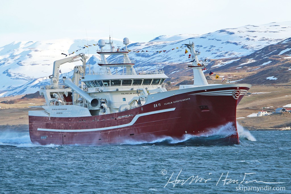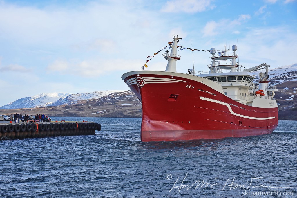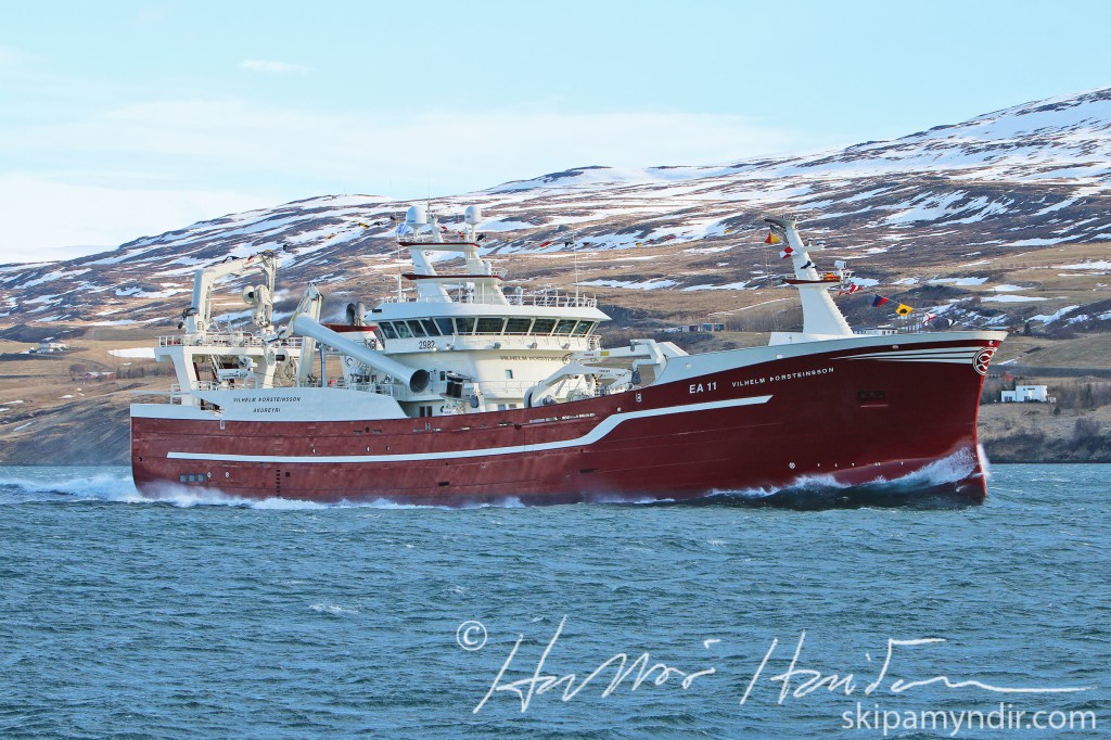 Vilhelm Thorsteinsson EA 11, a new pelagic fishing vessel built especially for Samherji, sailed into Eyjafjördur in Iceland for the first time yesterday. Vilhelm Thorsteinsson is a large, elegant and exceptionally well-equipped vessel, 89 meters long and 16.6 meters wide. The carrying capacity is well over three thousand tons in thirteen tanks, where the catch will be cooled down to bring the best possible raw material to land.
