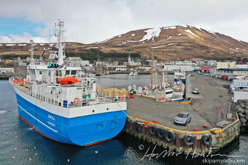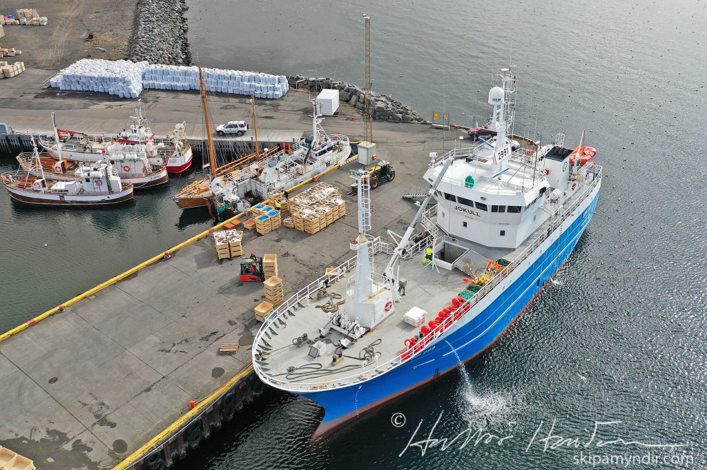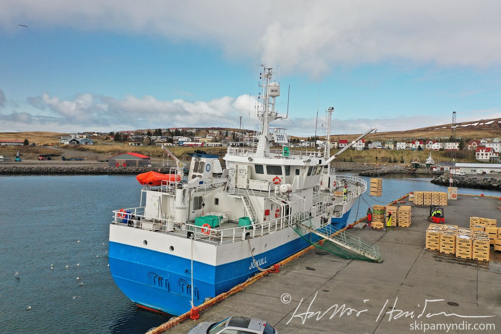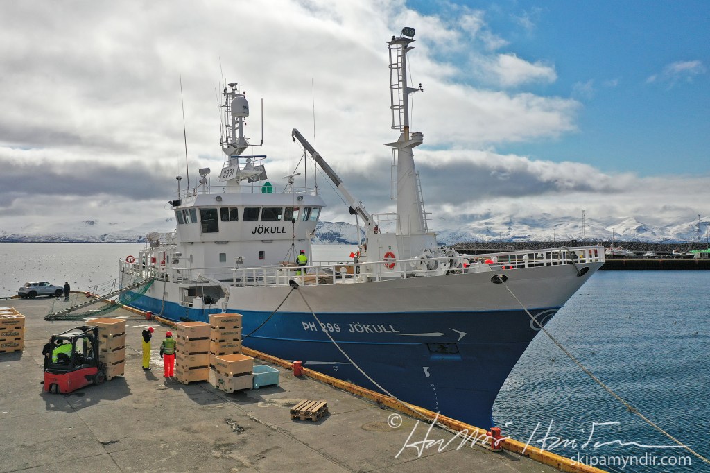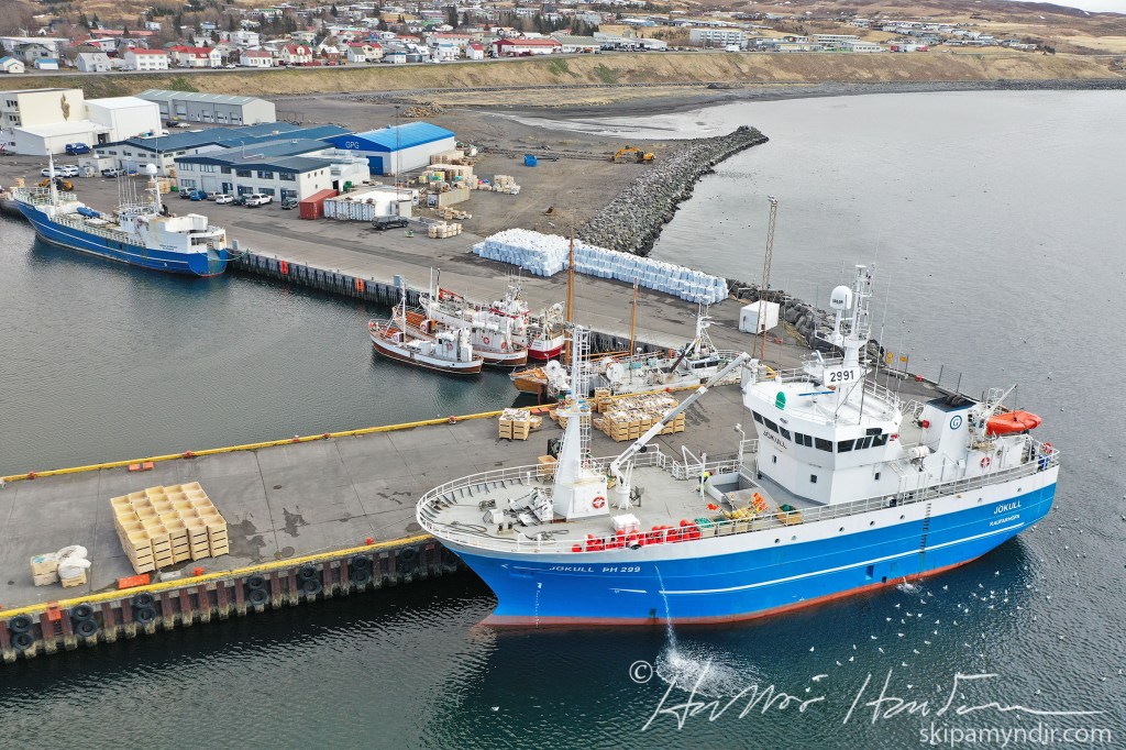 Efsta myndin var tekin um morguninn þegar Jökull kom að bryggju en hinar síðdegis þegar verið var að kara bátinn eftir löndun.