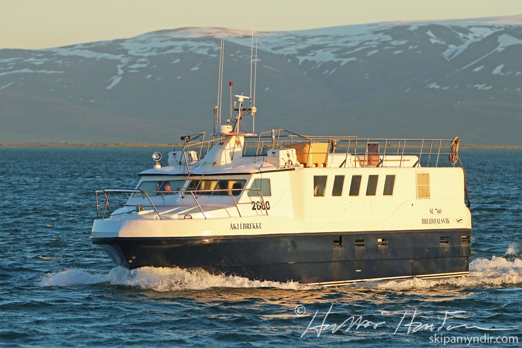 Áki í Brekku sem sést hér sigla inn til hafnar á Húsavík í kvöld hét upphaflega Happasæll KE 94. Hann var smíðaður í Seiglu ehf. í Reykjavík árið 2004 og er 29,90 brl/ 29,83 BT að stærð.