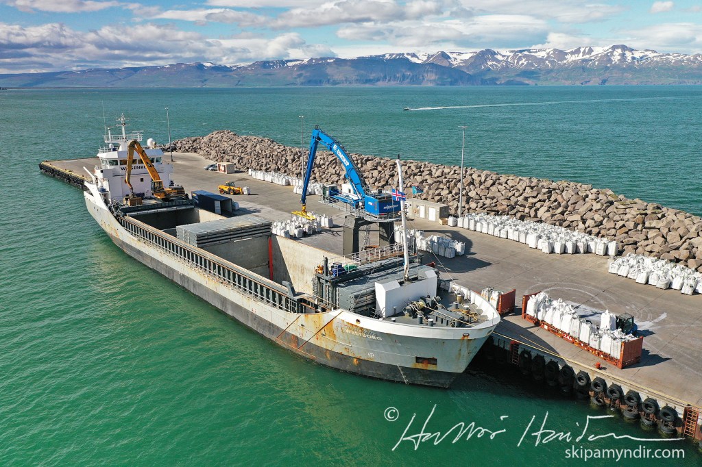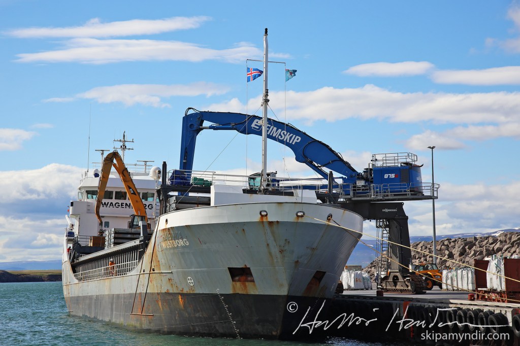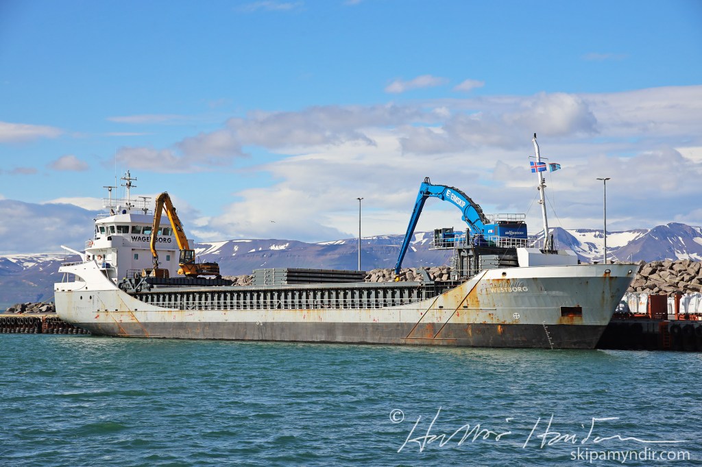 Flutningaskipið Westborg kom til Húsavíkur snemma í morgun og lagðist að Bökugarðinum hvar nú er verið að skipa út afurðum frá PCC á Bakka.