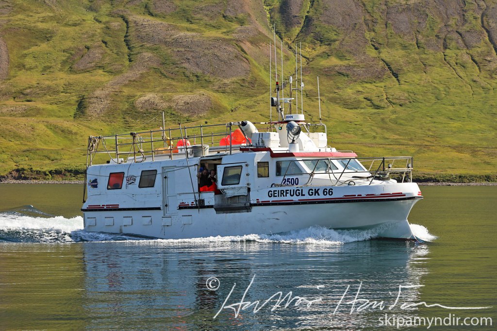 Línubáturinn Geirfugl GK 66 kemur hér að landi á Siglufirði á dögunum og nýja peran tekur sig bara vel út.