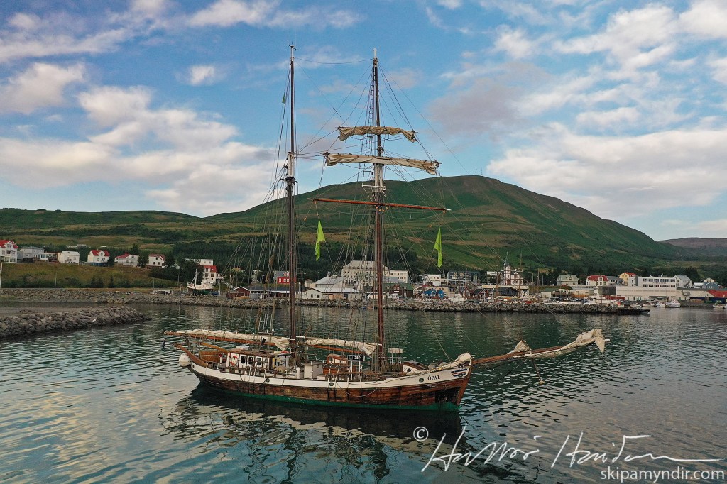 Þessi mynd sem var tekin undir kvöld í dag sýnir skonnortuna Ópal þar sem hún liggur á legunni í Húsavíkurhöfn.