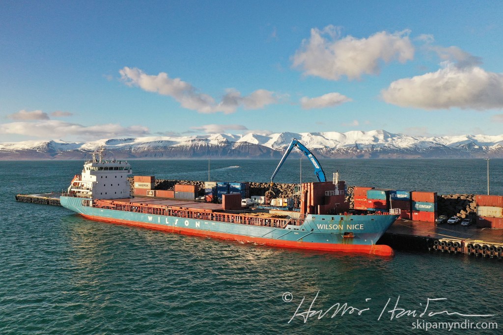 Flutningaskipið Wilson Nice liggur nú við Bökugarðinn á Húsavík þar sem uppskipun á trjáboli fyrir PCC á Bakka fer fram.
