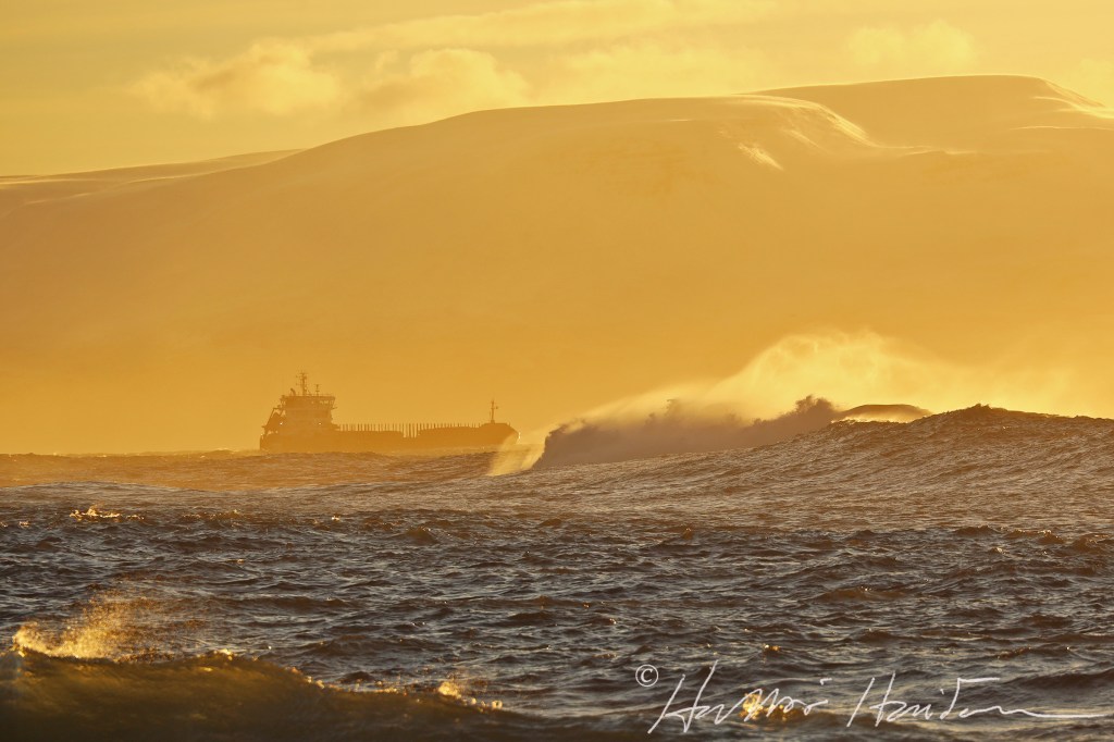 Það var brim við Skjálfanda í dag og síðdegissólin skein þegar þessi mynd var tekin út á Bakkahöfða.