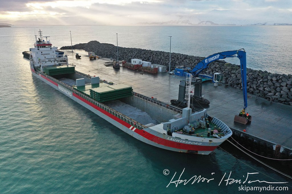 Hollenska flutningaskipið Lauwersborg kom til Húsavíkur í morgun og lagðist að Bökugarðinum hvar nú er verið að skipa upp hráefnisfarmi til kísilvers PCC á Bakka.