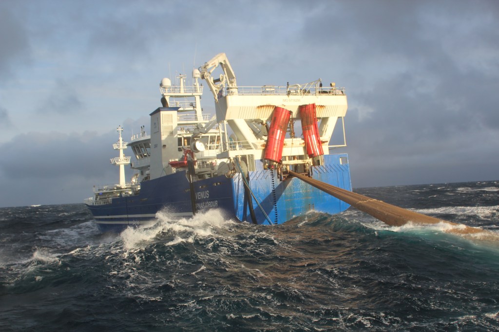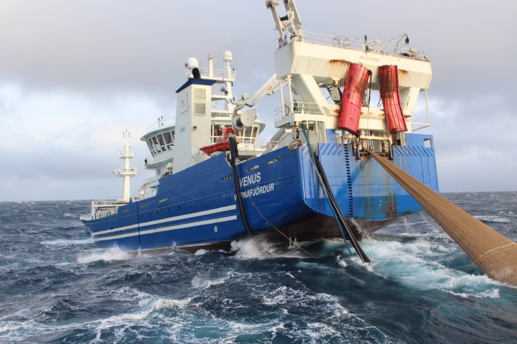 Með fylgjandi myndir voru teknar á síldarmiðnum og sýna Víking AK 100 og Venus NS 150 þegar það síðarnefnda var að dæla um 620 tonnum íslenskrar síldar yfir í það fyrrnefnda.