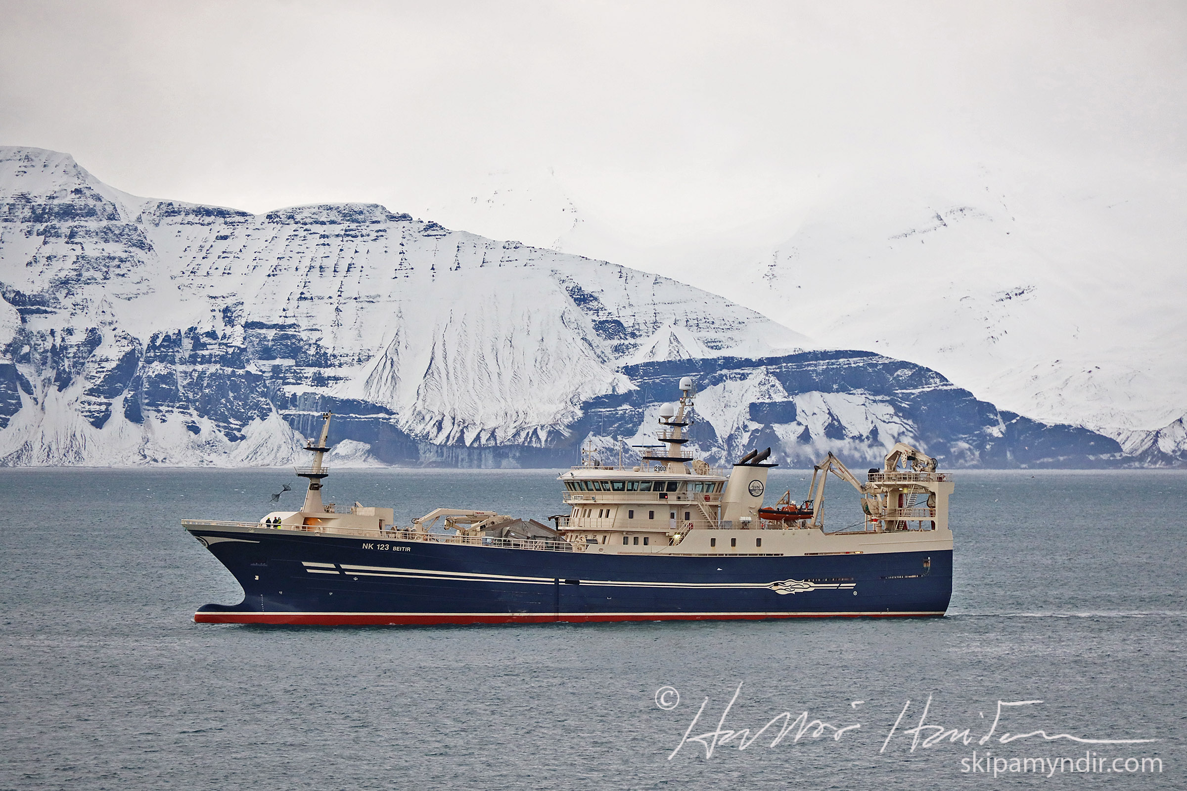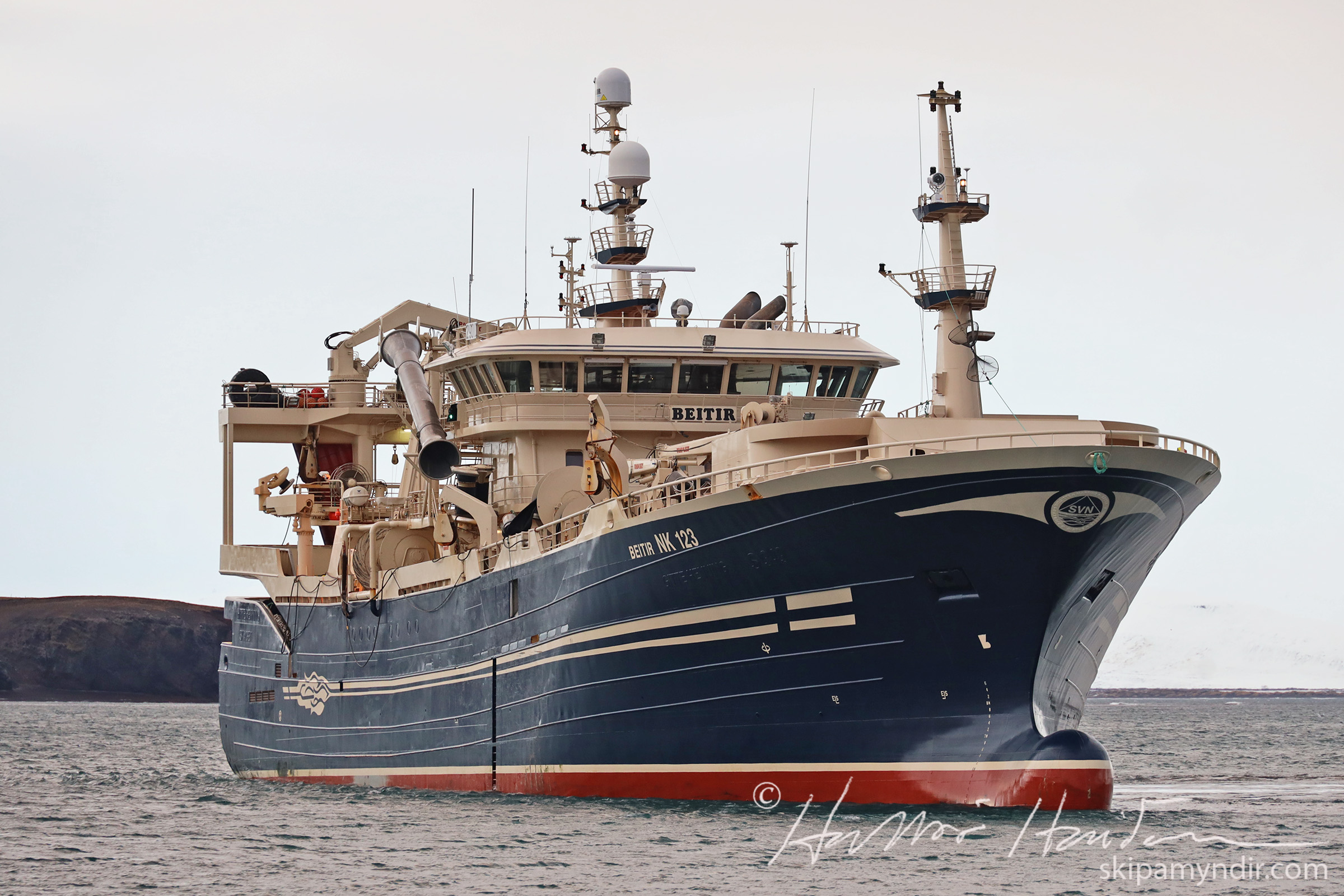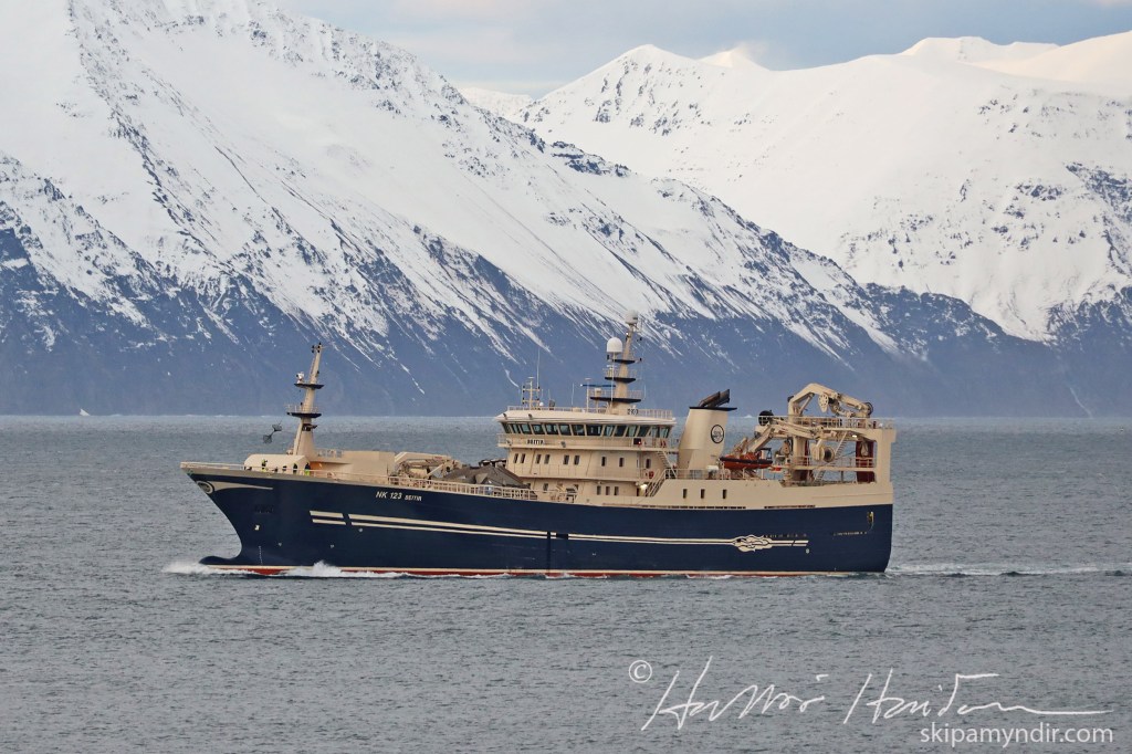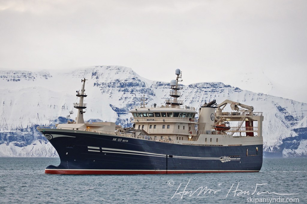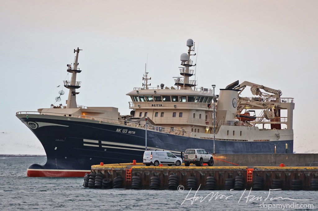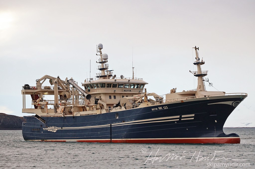 Beitir NK 123, sem var við loðnuleit, er 86,3 metrar að lengd, 17,6 metrar að breidd og mælist 4.138 brúttótonn að stærð.