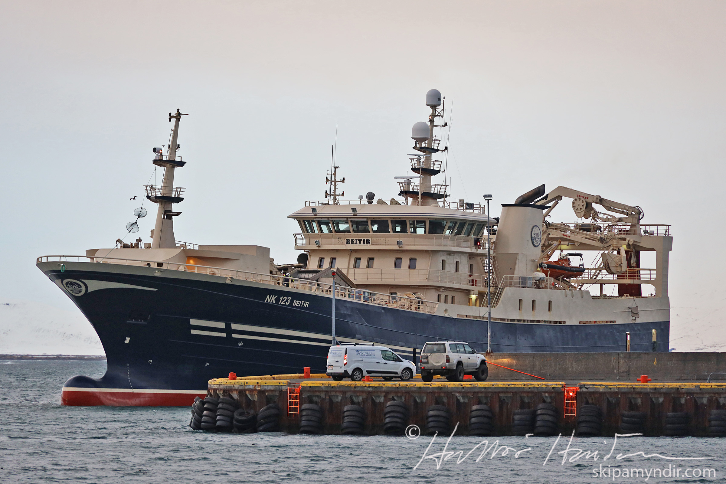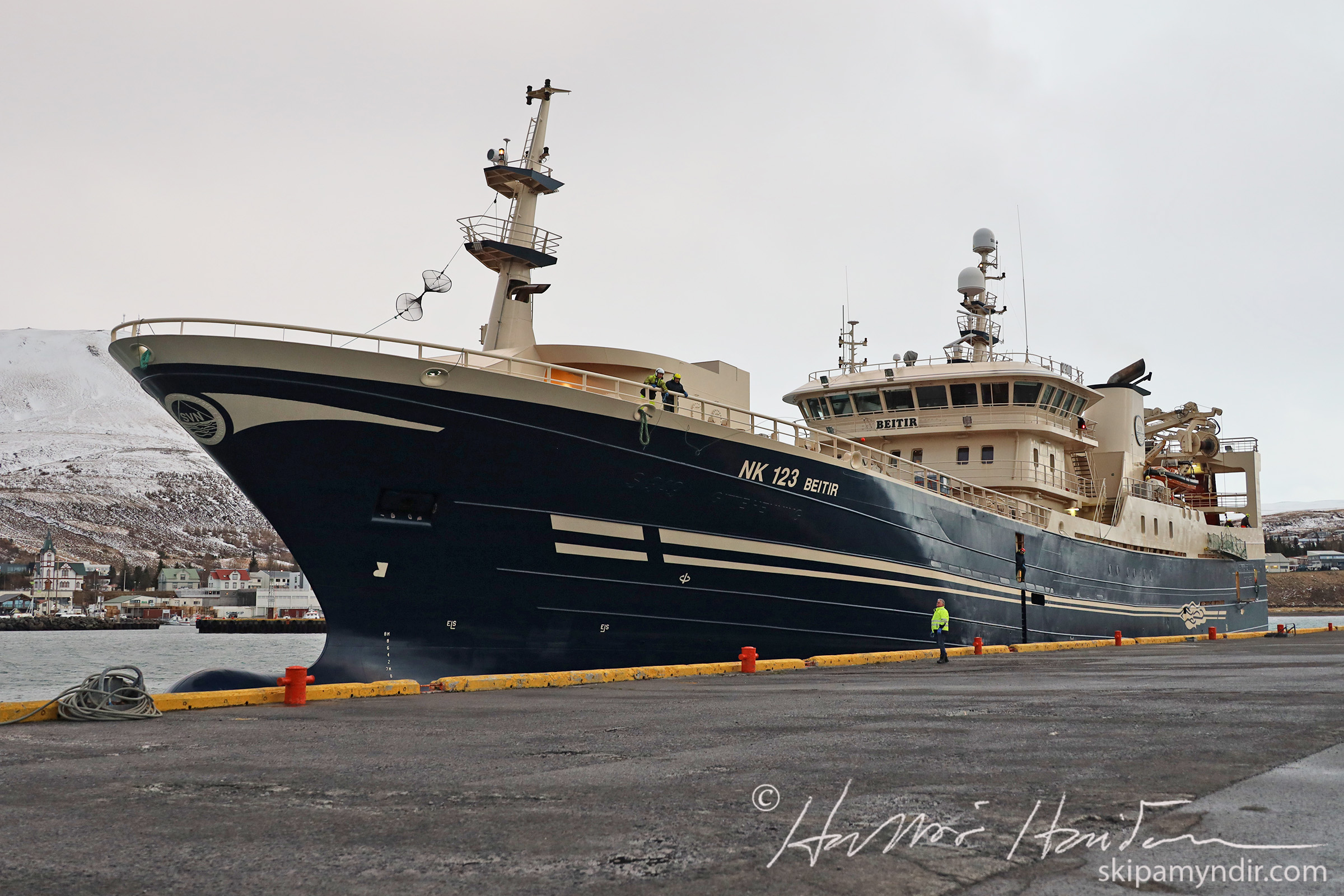 Nóta- og togskipið Beitir NK 123 kom til Húsavíkur í dag og hygg ég að þetta sé stærsta fiskiskip sem lagst hefur að bryggju hér í bæ.
