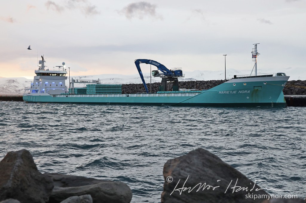 Flutningaskipið Marietje Nora kom til Húsavíkur í morgun og lagðist að Bökugarðinum hvar nú er verið að skipa upp hráefnisfarmi til kísilvers PCC á Bakka.
