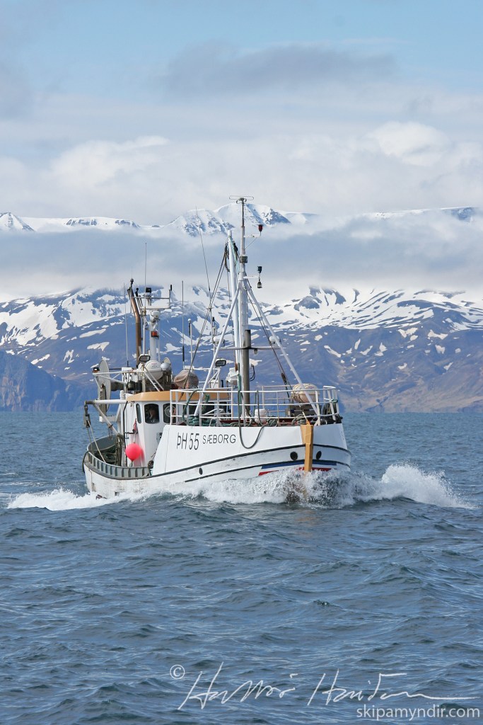 Sæborg ÞH 55 siglir hér um Skjálfandaflóa á sjómannadeginum árið 2005 en þarna var hún í eigu Hraunútgerðarinnar ehf. á Húsavík.