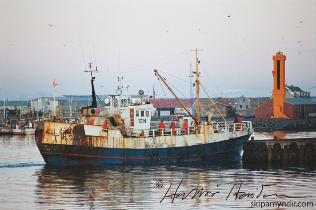 Netabáturinn Arney KE 50 kemur hér að bryggju í Sandgerði á vetrarvertíð um miðjan níunda áratug síðustu aldar.