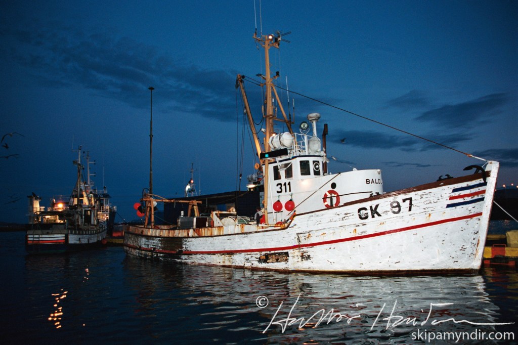 Dragnótabáturinn Baldur GK 97 er hér við bryggju í Keflavík um árið. Bugtin nýbyrjuð þarna og löndun lokið eftir að kvölda tók.