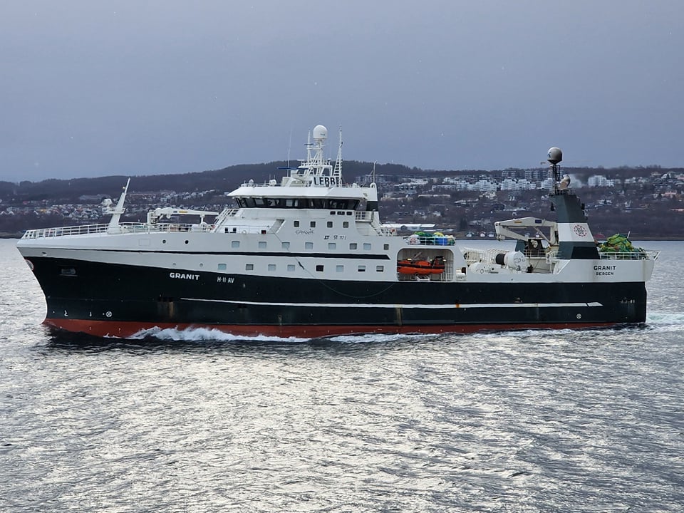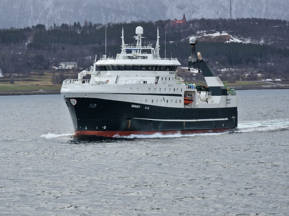Norski frystitogarinn Granit H-11-AV er hér á útleið frá Tromsø en Eiríkur Sigurðsson skipstjóri á Reval Viking myndaði hann í morgun þegar hann var á landleið.