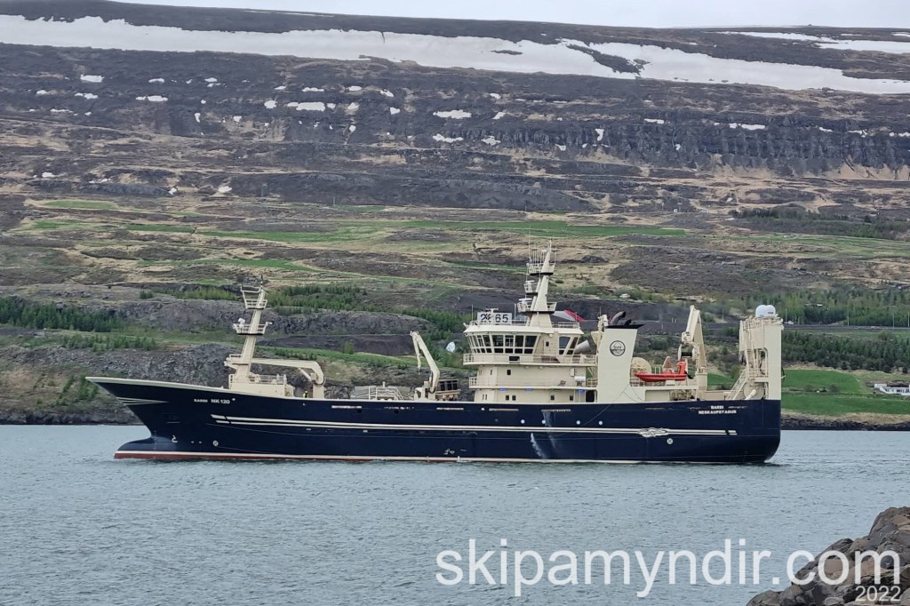 Skip Síldarvinnslunnar, Barði NK 120, sést hér yfirgefa Akureyri á dögunum en þar var skipið í slipp.