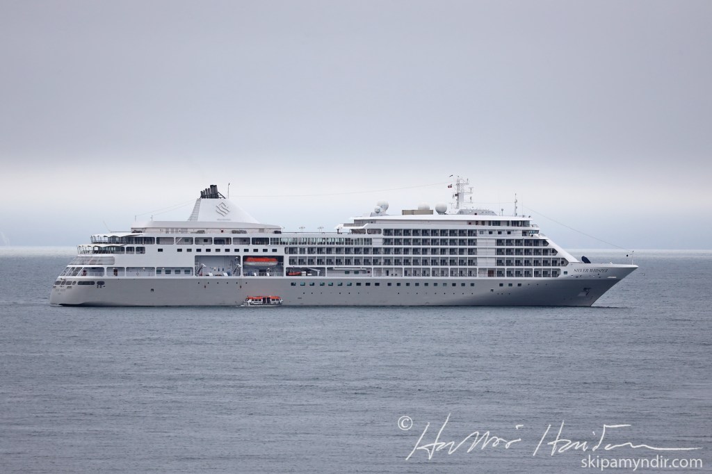 Farþegaskipið Silver Whisper hefur legið við ankeri hér út af Húsavíkur síðan í morgun og fyrst um sinn sást nú lítið til þess vegna þoku.